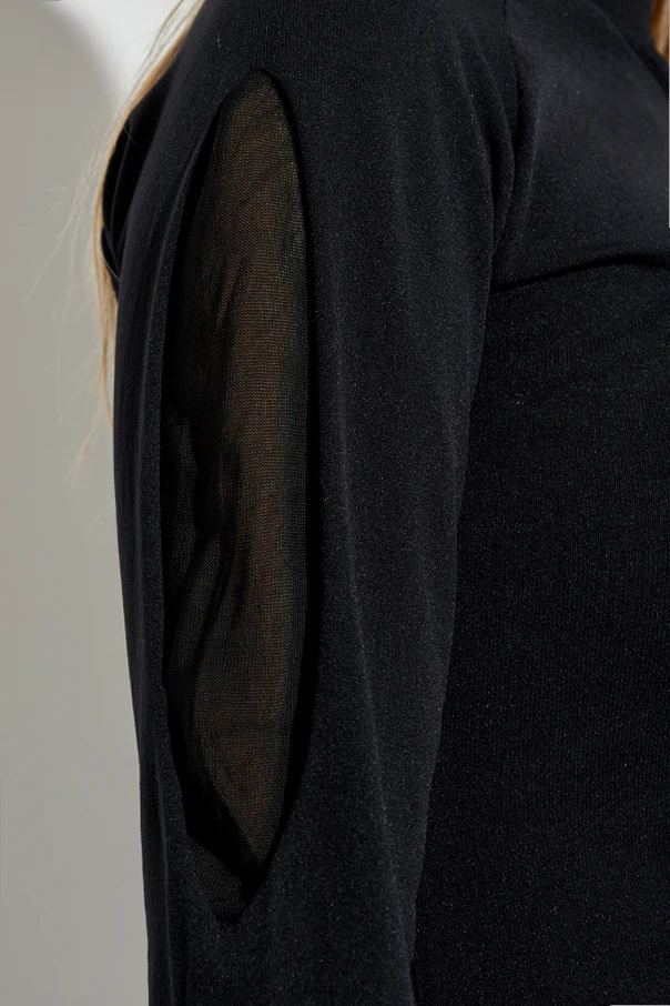 Golf z długimi rękawami to wyrafinowana propozycja dla kobiet ceniących esencję subtelnej elegancji i nowoczesnej formy. Ciemny, głęboki odcień czerni harmonijnie łączy się z gładką dzianiną, której lekko taliowany krój doskonale akcentuje sylwetkę, oferując niezwykle komfortowe dopasowanie. Delikatna, elastyczna stójka oraz wyrafinowane, transparentne panele siateczkowe wzdłuż rękawów stanowią efektowny akcent, wnosząc powiew świeżości i oryginalności do klasyki gatunku.
