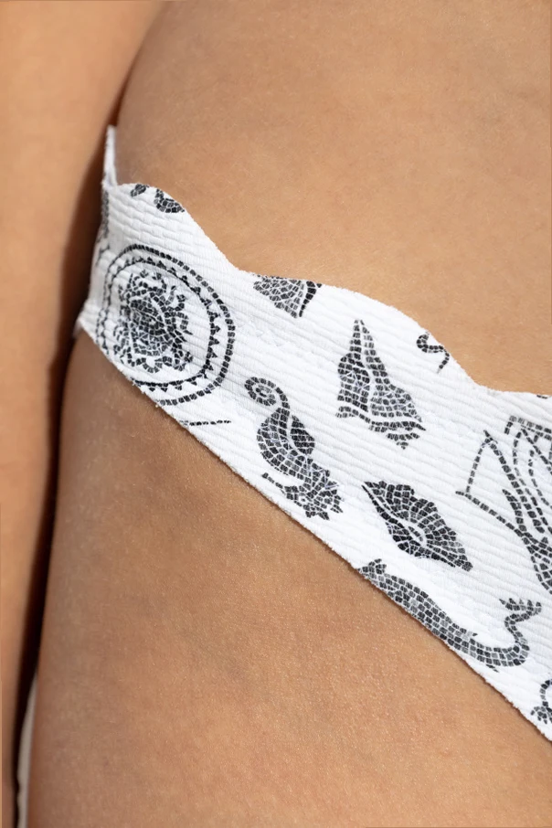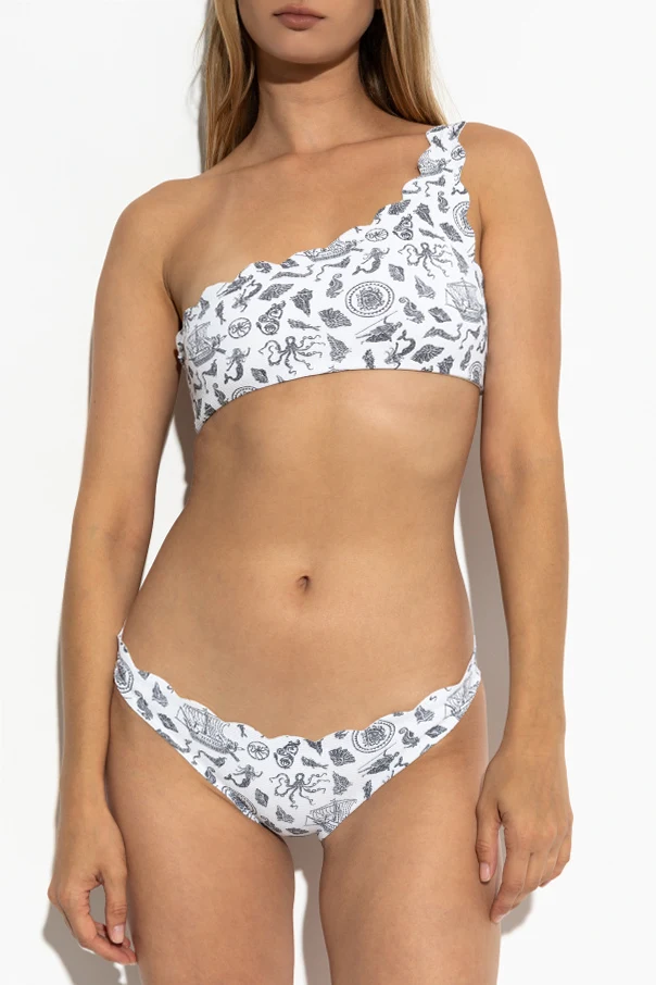 Dwustronny dół od kostiumu kąpielowego autorstwa Marysia to wysublimowany wybór dla kobiet ceniących subtelną elegancję oraz artystyczny detal. Zachwyca przemyślanym fasonem klasycznych fig z delikatnie wyciętymi liniami, które subtelnie podkreślają sylwetkę, zwieńczonych wyraźnie falowanym brzegiem w kształcie półokręgów.