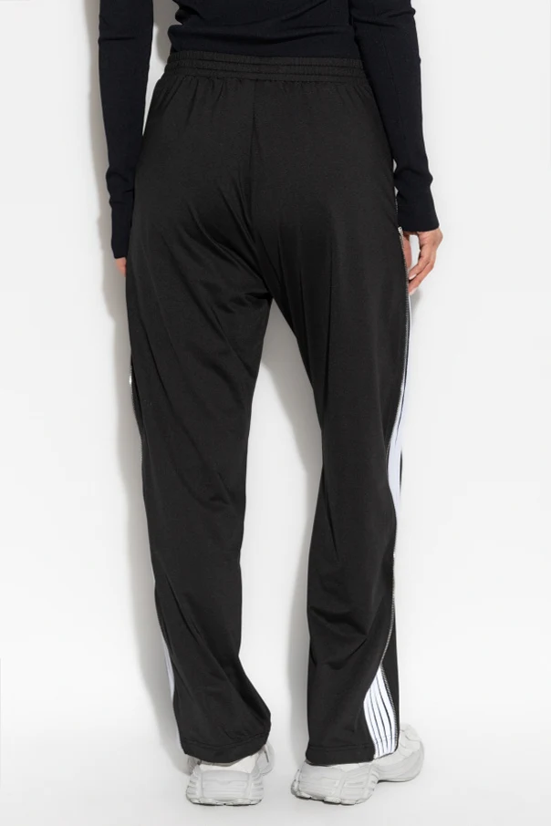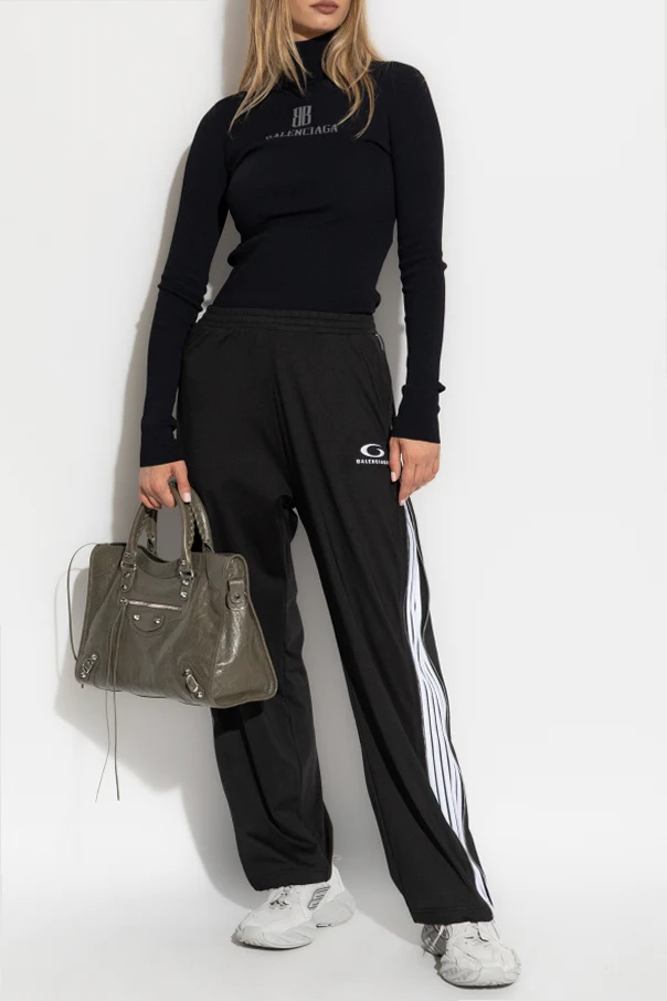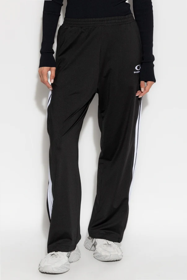 Spodnie dresowe z nogawkami o prostym kroju marki Balenciaga reprezentują subtelne połączenie ponadczasowej elegancji z awangardowym duchem współczesnej mody. Głęboka czerń w zestawieniu z charakterystycznymi trzema białymi paskami po bokach każdej nogawki nadaje całości wyrafinowanego wyrazu, akcentując przy tym nowoczesny charakter produktu.