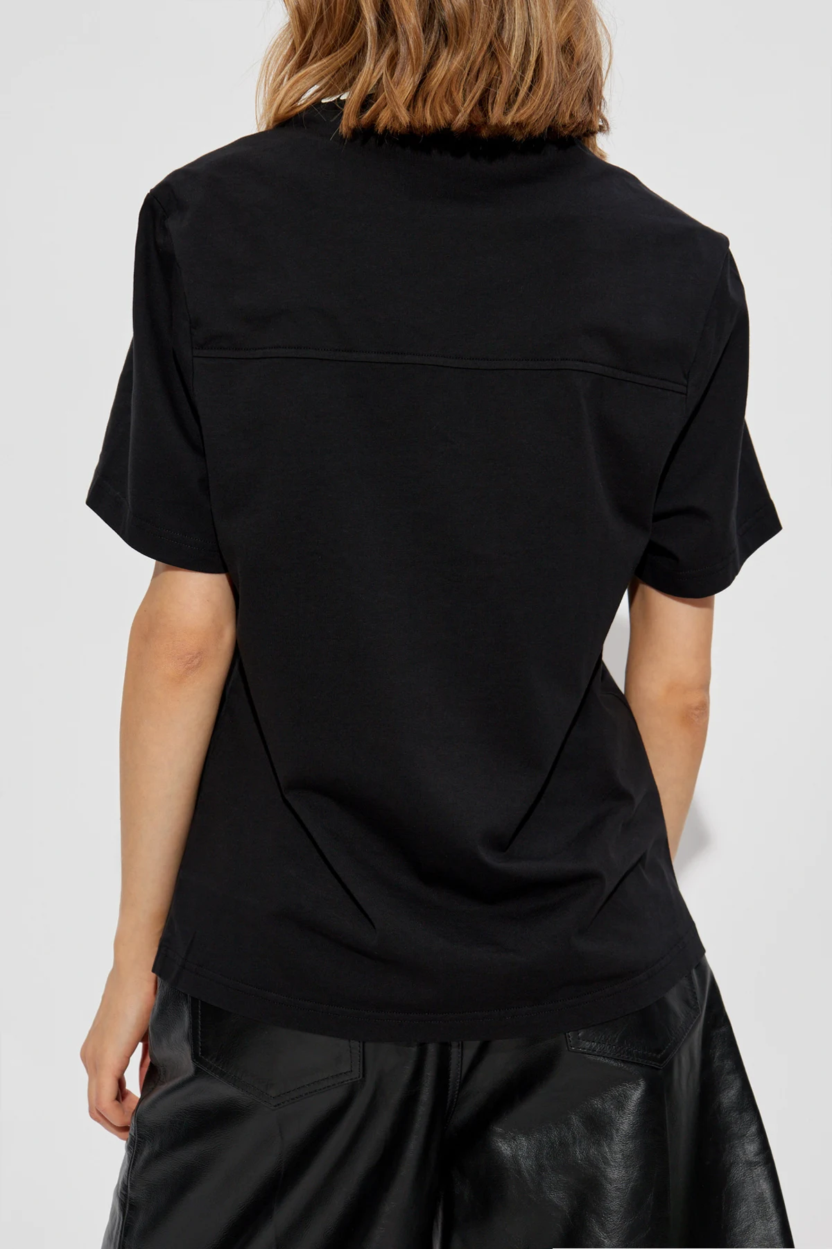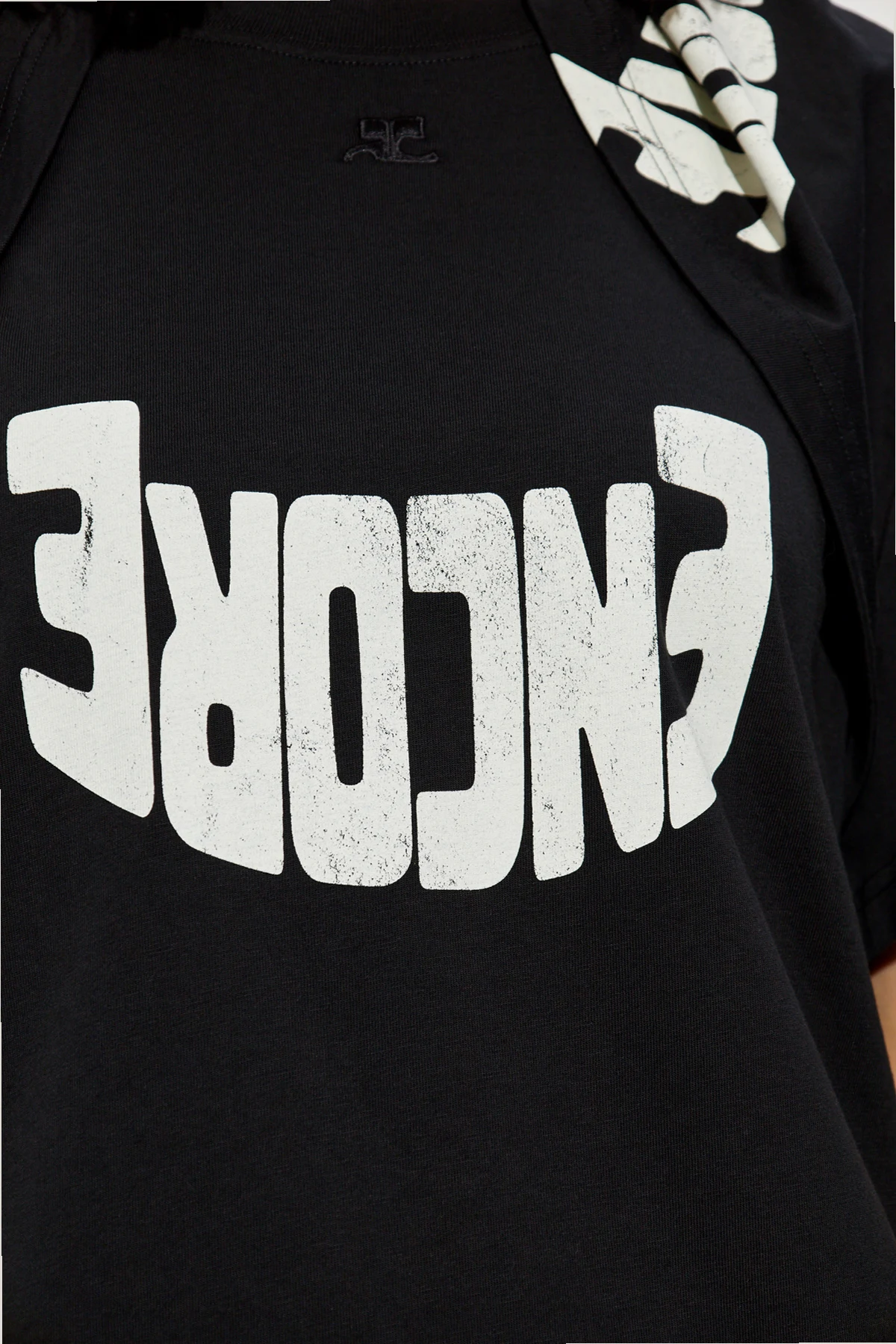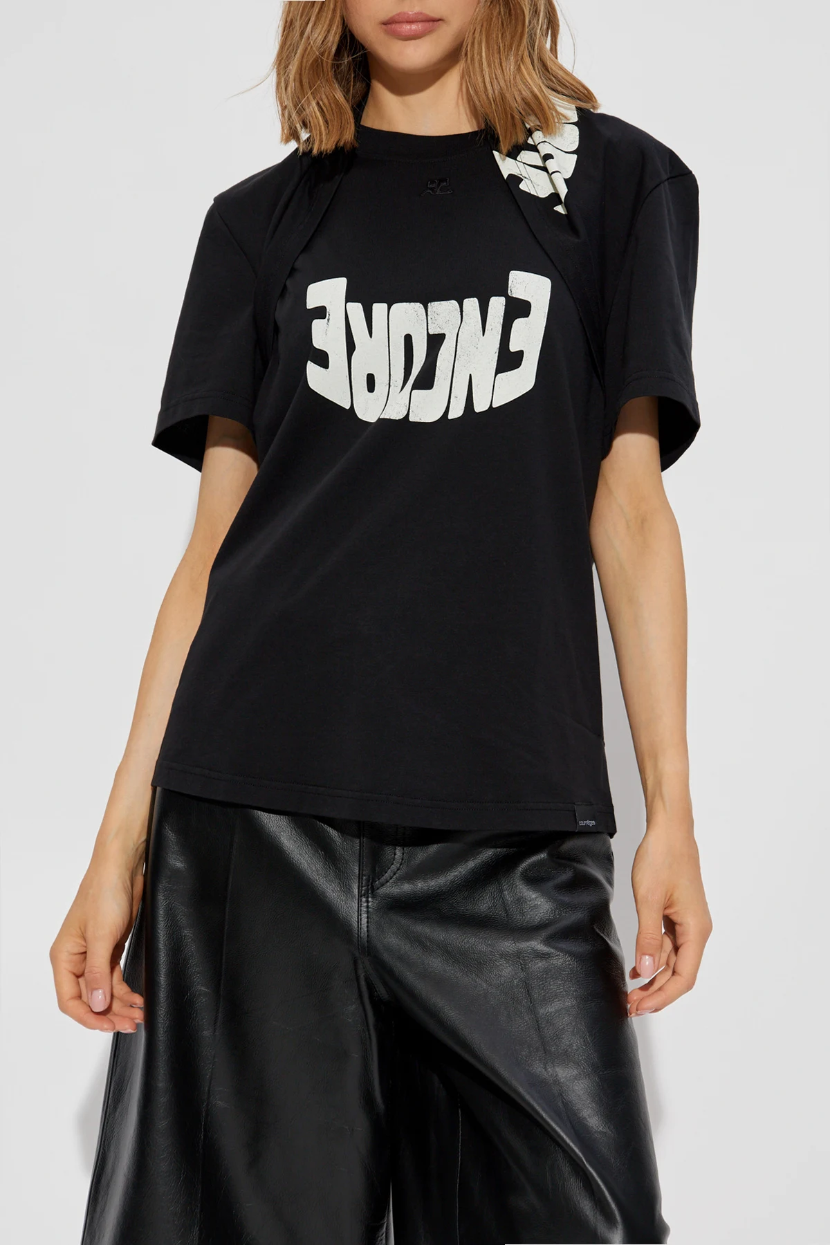 Prezentowany czarny T-shirt z krótkim rękawem to kwintesencja elegancji i nowoczesności, sygnowany przez ekskluzywną markę Courrèges . Wykonany z miękkiej, wysokiej jakości bawełny, zapewnia maksymalny komfort noszenia.