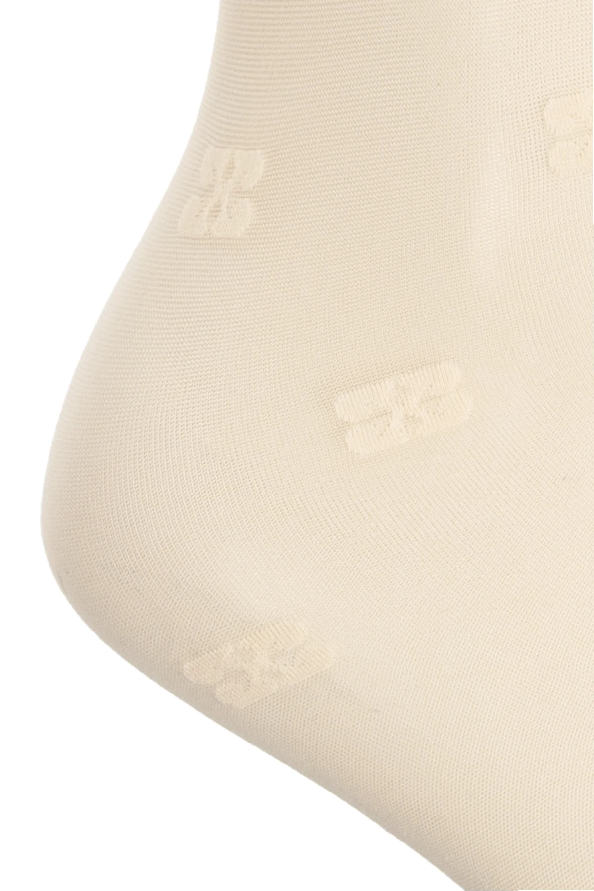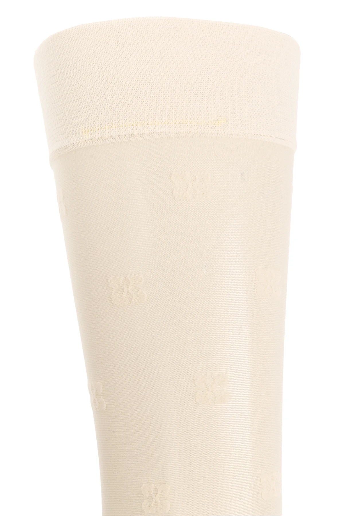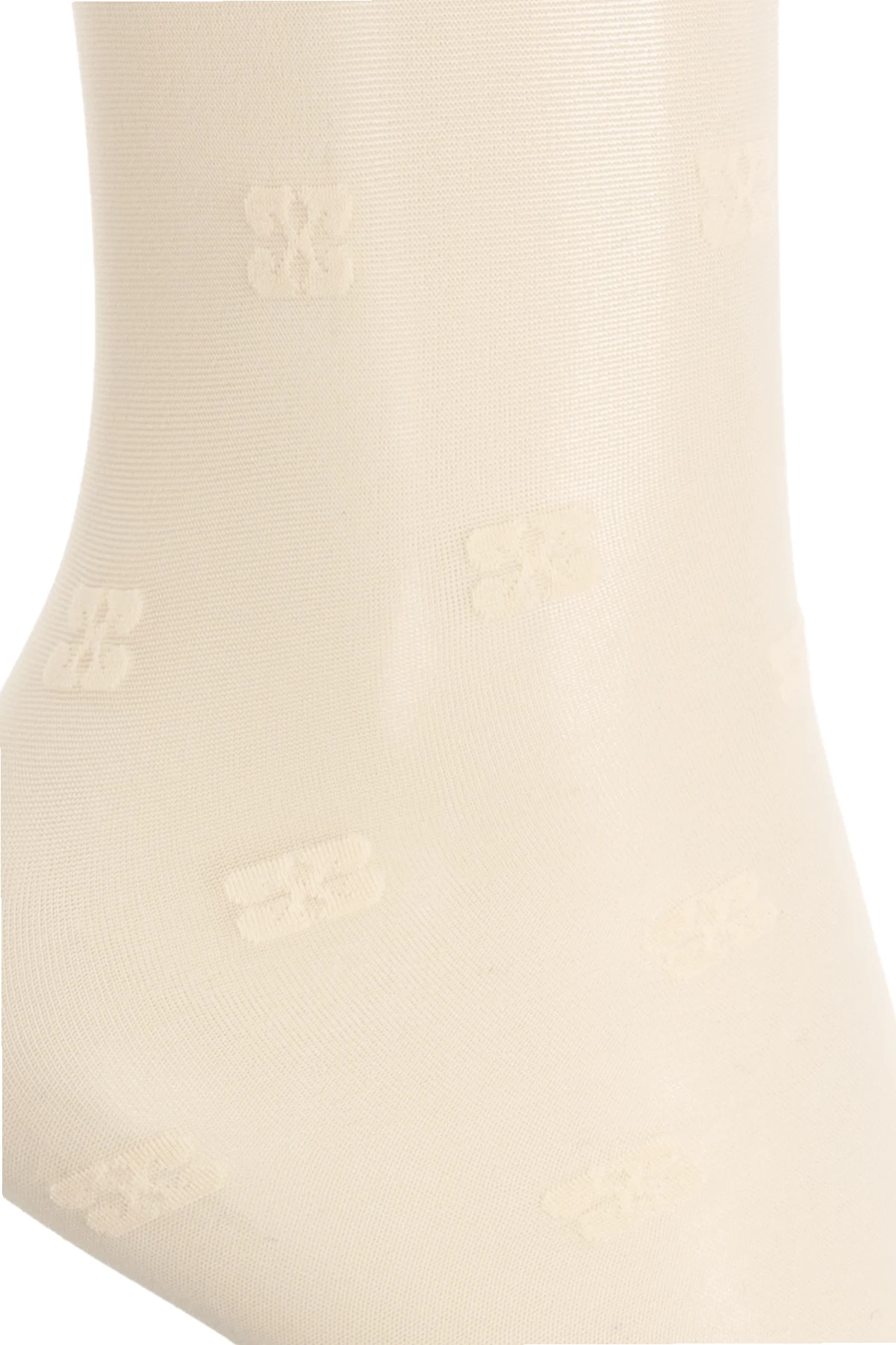 Kremowe, lekko transparentne podkolanówki Ganni. Wykonane z materiału z recyklingu. Ozdobione wzorem z monogramem. Wykończone ściągaczem.