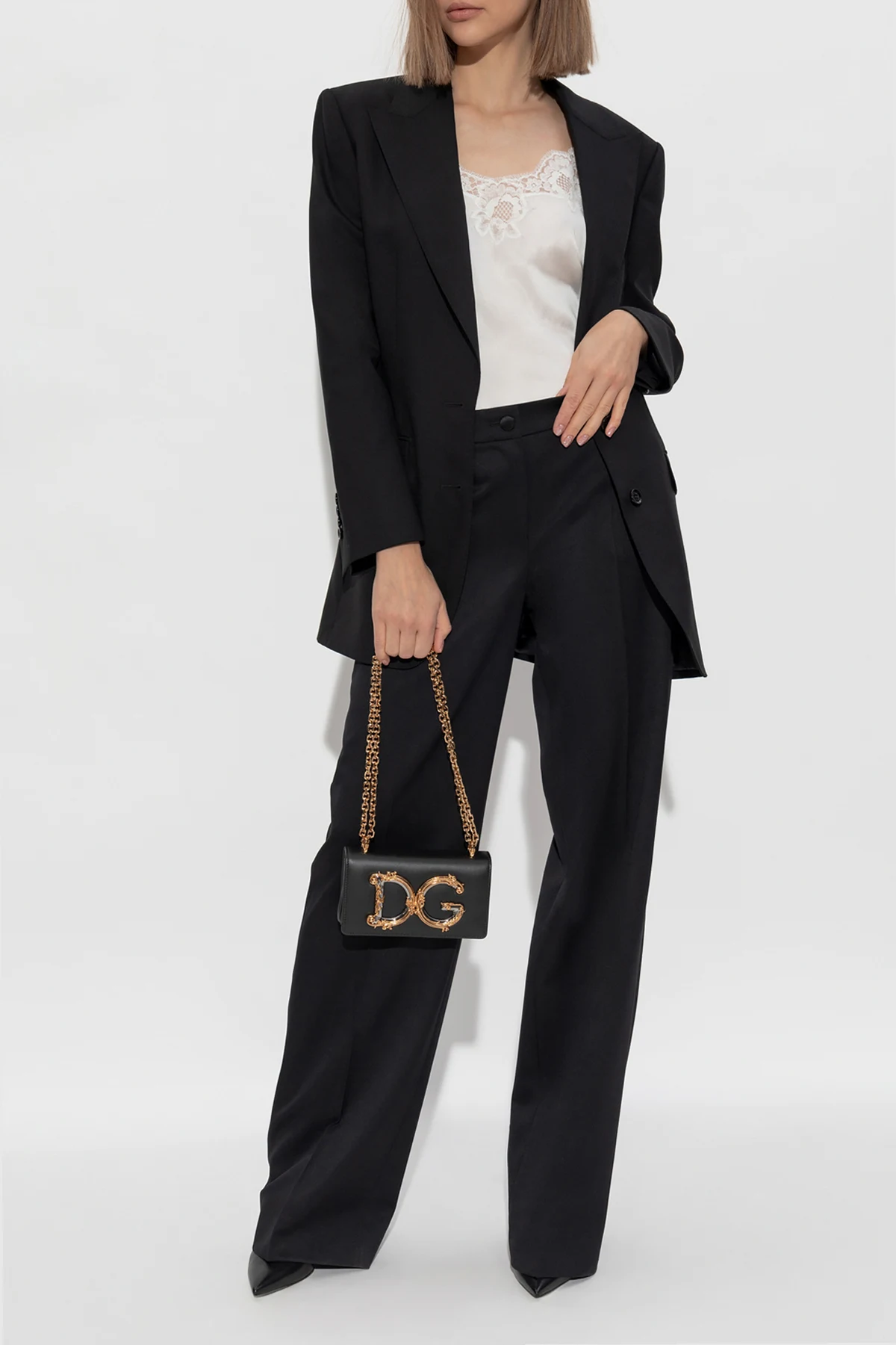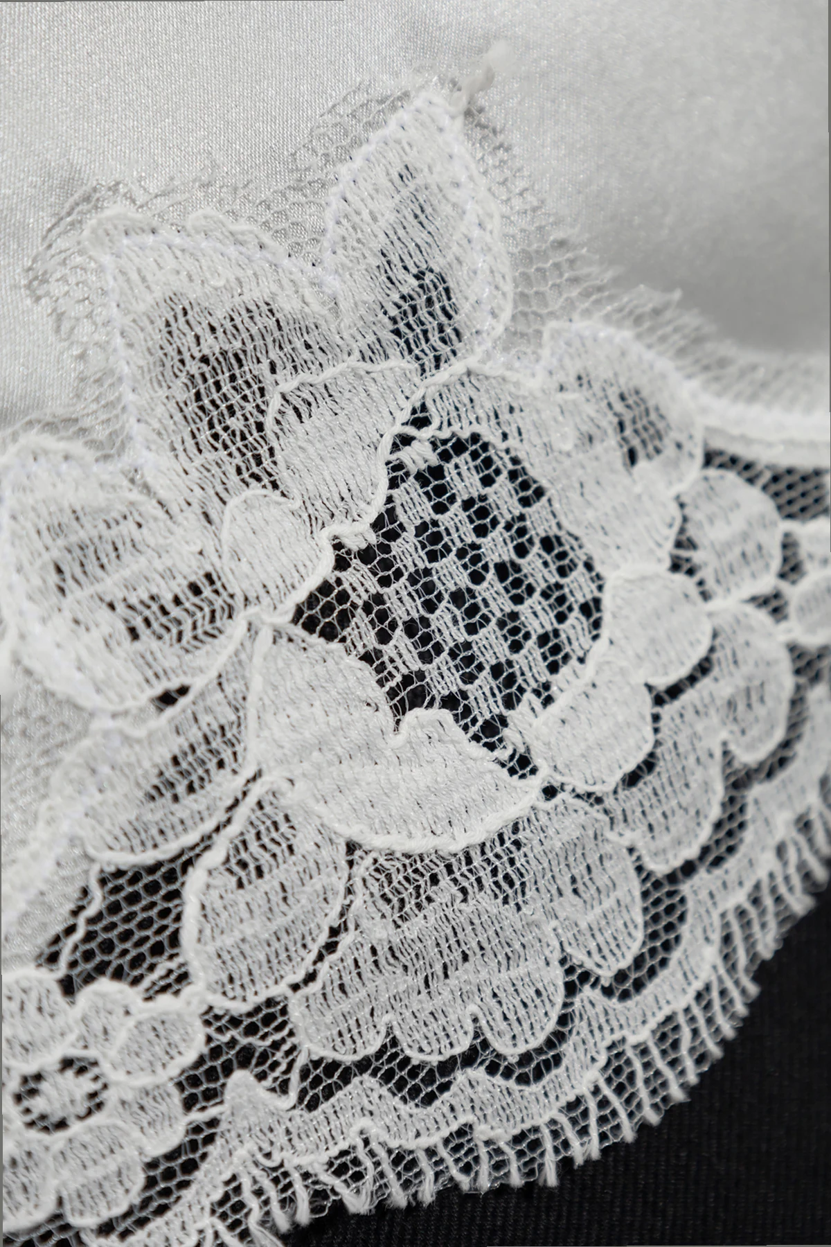 Biała, jedwabna góra od piżamy na ramiączkach Dolce & Gabbana. Koronkowe wykończenie z wyszytym motywem kwiatowym w kolorze beżowym. Dekolt w serek.