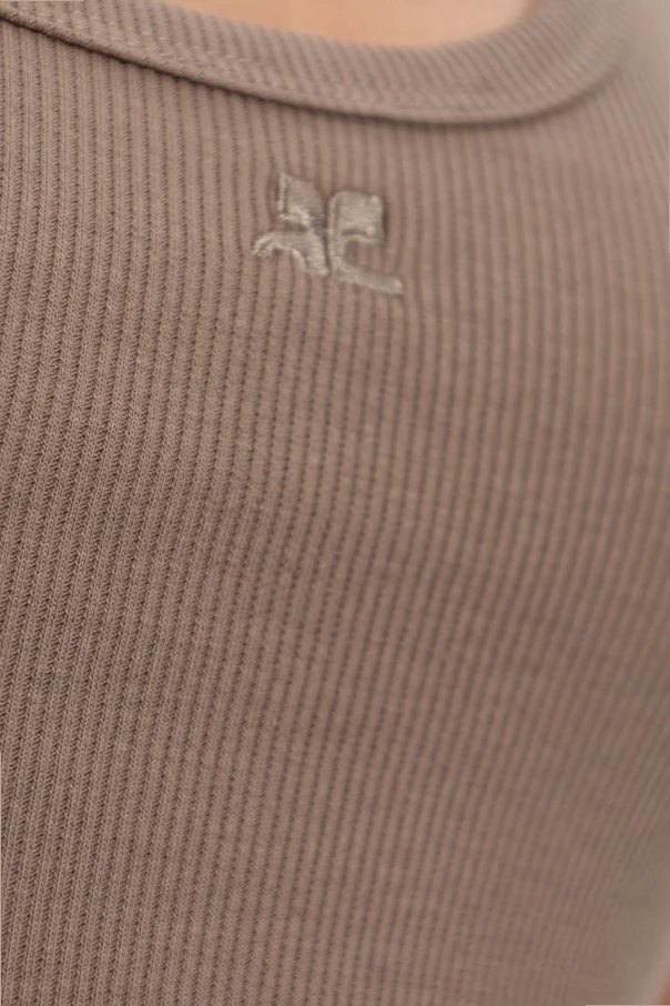 Prążkowany top marki Courrèges to wyrafinowana propozycja dla koneserek wysmakowanej mody. Intrygujący, dopasowany krój z asymetrycznym układem ramiączek — klasycznym z jednej strony, a z drugiej szerokim paskiem typu halter, spinanym efektowną napą przy obojczyku — nadaje całości niepowtarzalnego charakteru.
