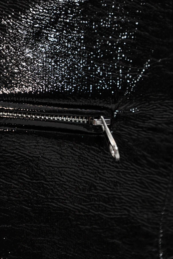 Wykonana z połyskującego, lekko tłoczonego materiału imitującego skórę, subtelnie odbija światło, nadając sylwetce wyjątkowej szlachetności. Dwie delikatne, metalowe kieszonki z przodu, zapinane na srebrne zamki, wprowadzają industrialną nutę, a pionowe przeszycia optycznie wysmuklają linię ciała.