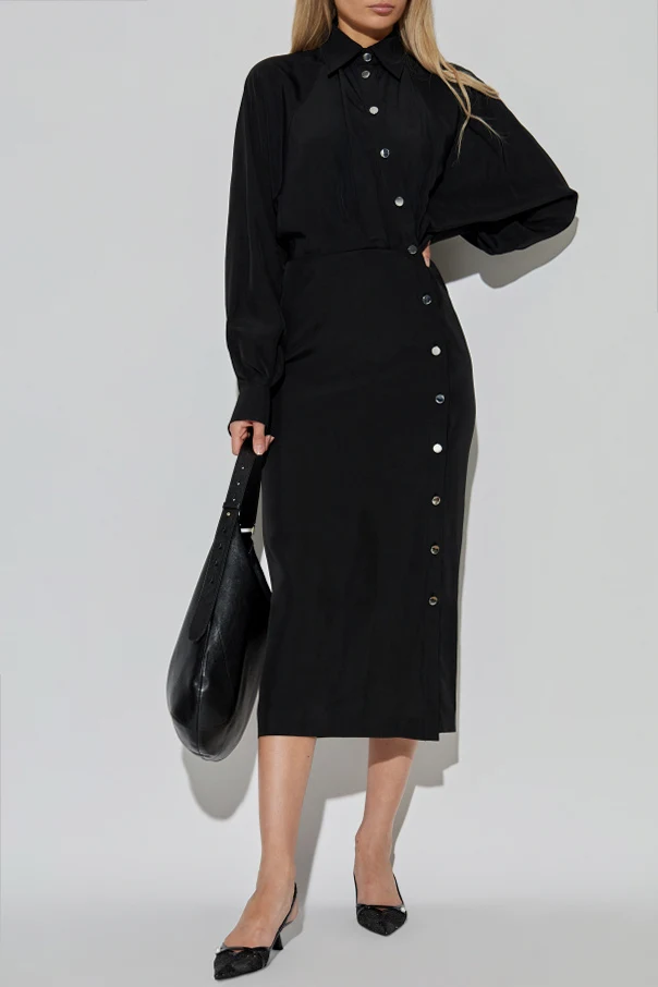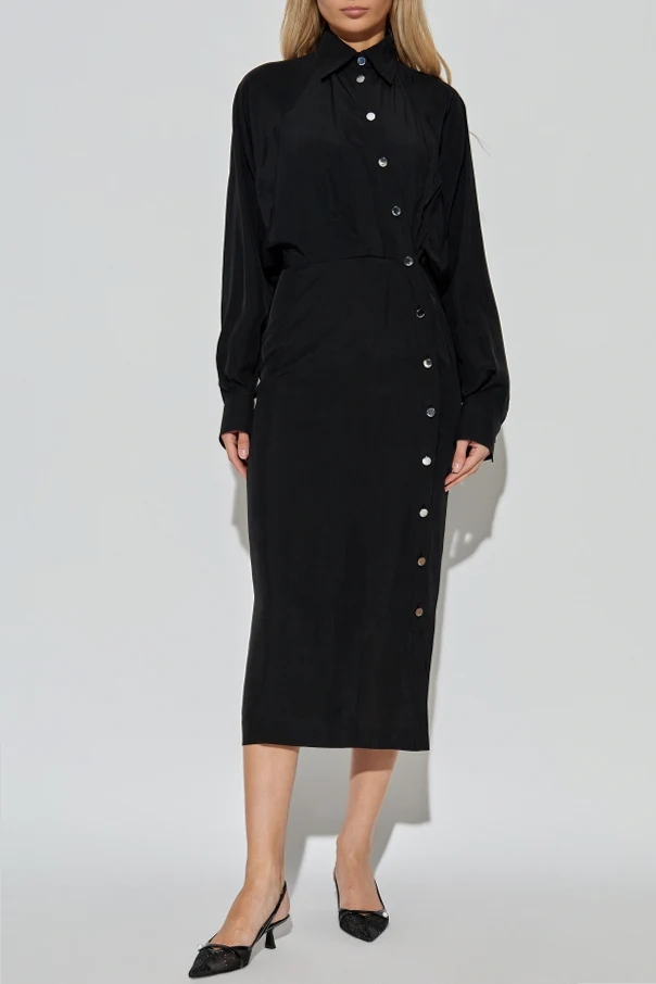 Delikatnie błyszczące, połyskujące guziki w srebrnej tonacji, ułożone asymetrycznie na gładkiej, czarnej tkaninie, stanowią znak rozpoznawczy tej kreacji i dodają jej nowoczesnego charakteru. Sukienka została uszyta z wyselekcjonowanej, miękkiej wiskozy, zapewniając komfort noszenia i piękne układanie się materiału.