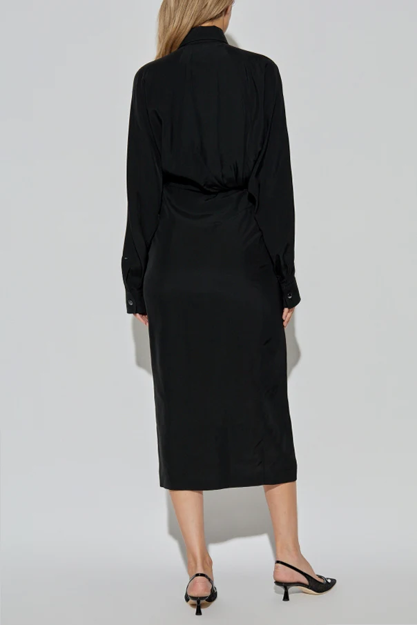 Sukienka „Maranta” marki Sportmax to kwintesencja współczesnej elegancji, inspirowana włoskimi tradycjami krawiectwa. Model o długości midi przykuwa wzrok starannym wyprofilowaniem – talia została wyraźnie zaznaczona, podkreślając smukłość sylwetki, podczas gdy swobodna, koszulowa góra z szerokimi, długimi rękawami i mankietami nadaje całości niepowtarzalnej swobody.
