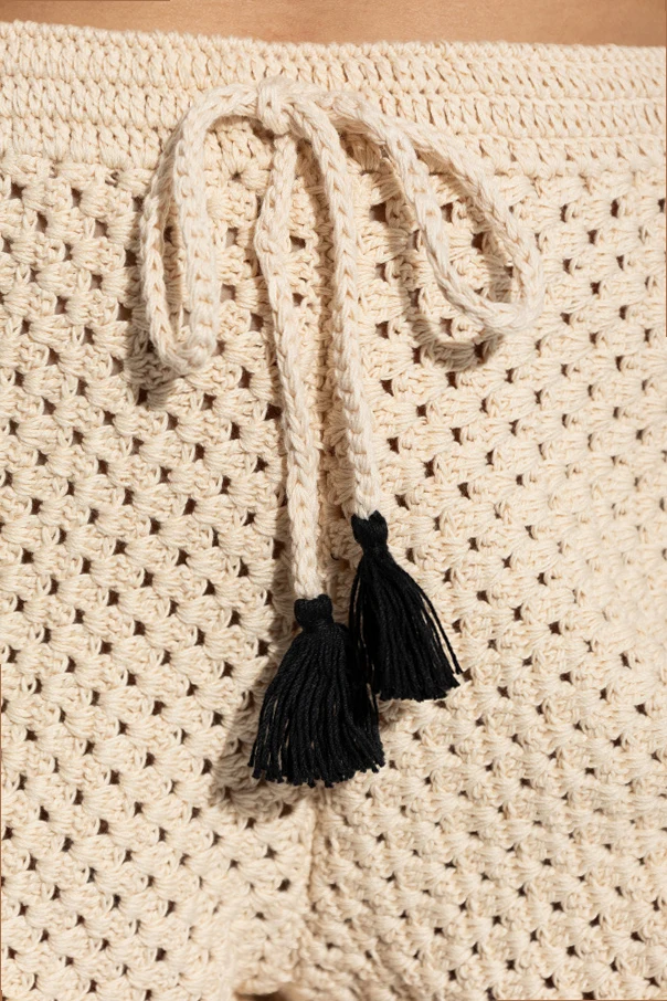 Dzianinowe szorty Hali autorstwa The Upside to kwintesencja nieprzeciętnej elegancji połączonej z codziennym komfortem. Wykonane z wysokojakościowej dzianiny o kunsztownym, ażurowym splocie, emanują subtelnym, rękodzielniczym wykończeniem. Jednolity beż przełamany został czarnymi wstawkami po bokach, które modelują linię bioder i podkreślają wyjątkowy charakter szortów.