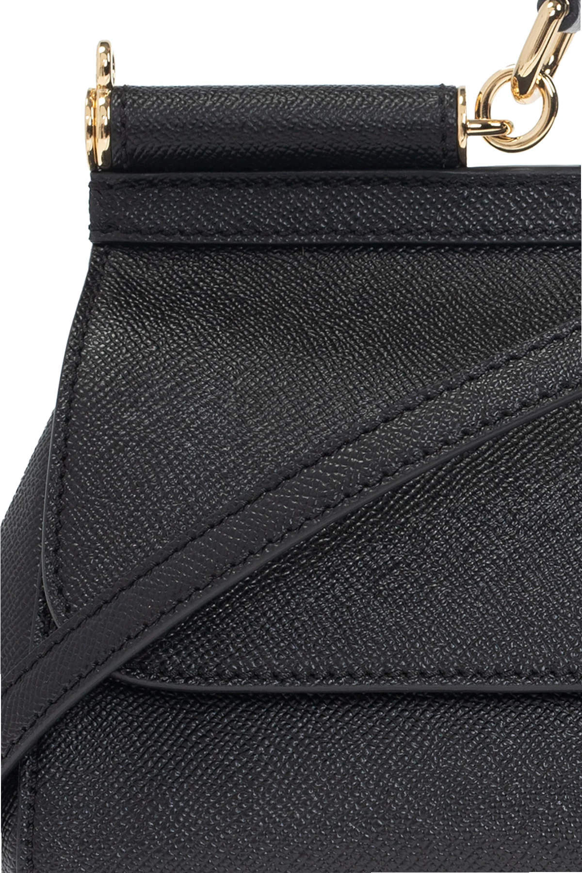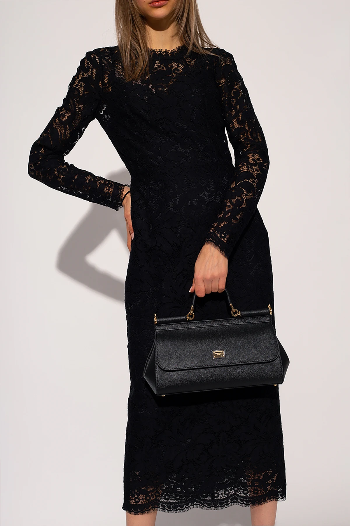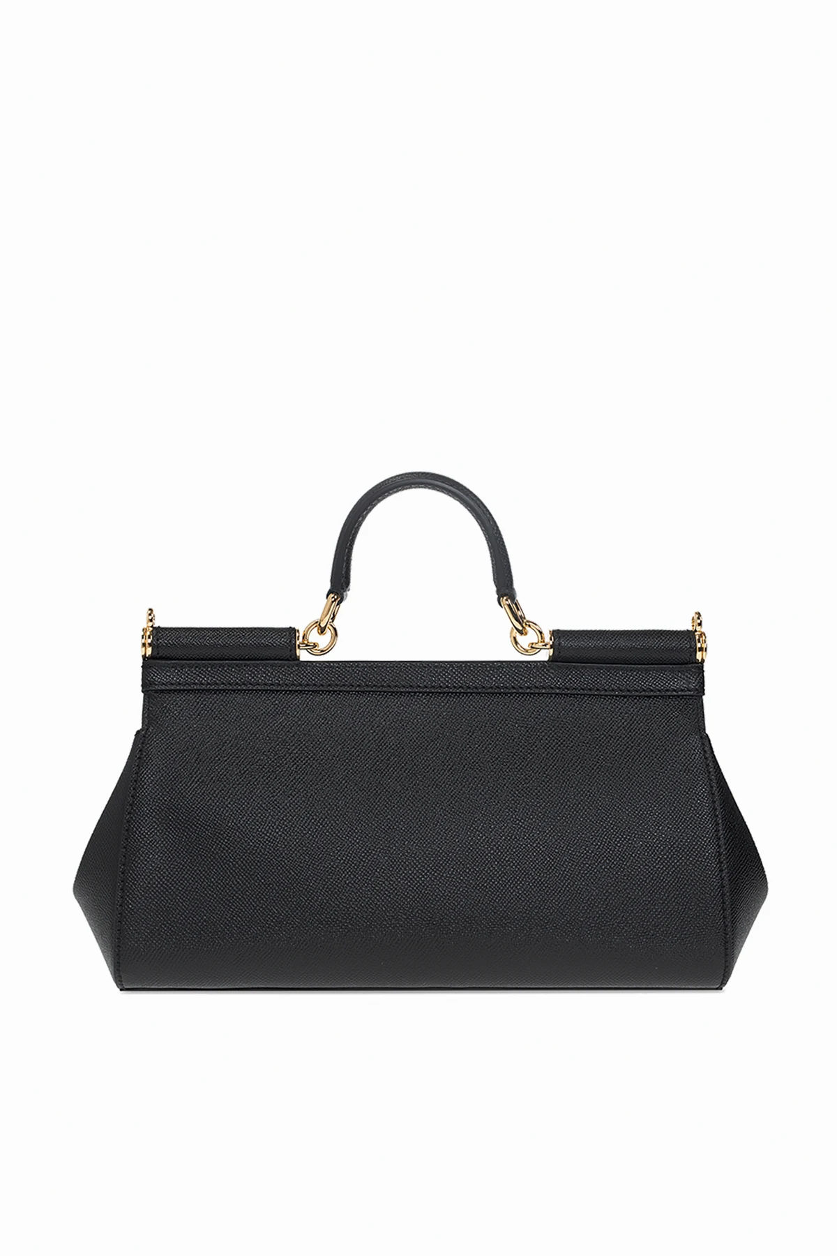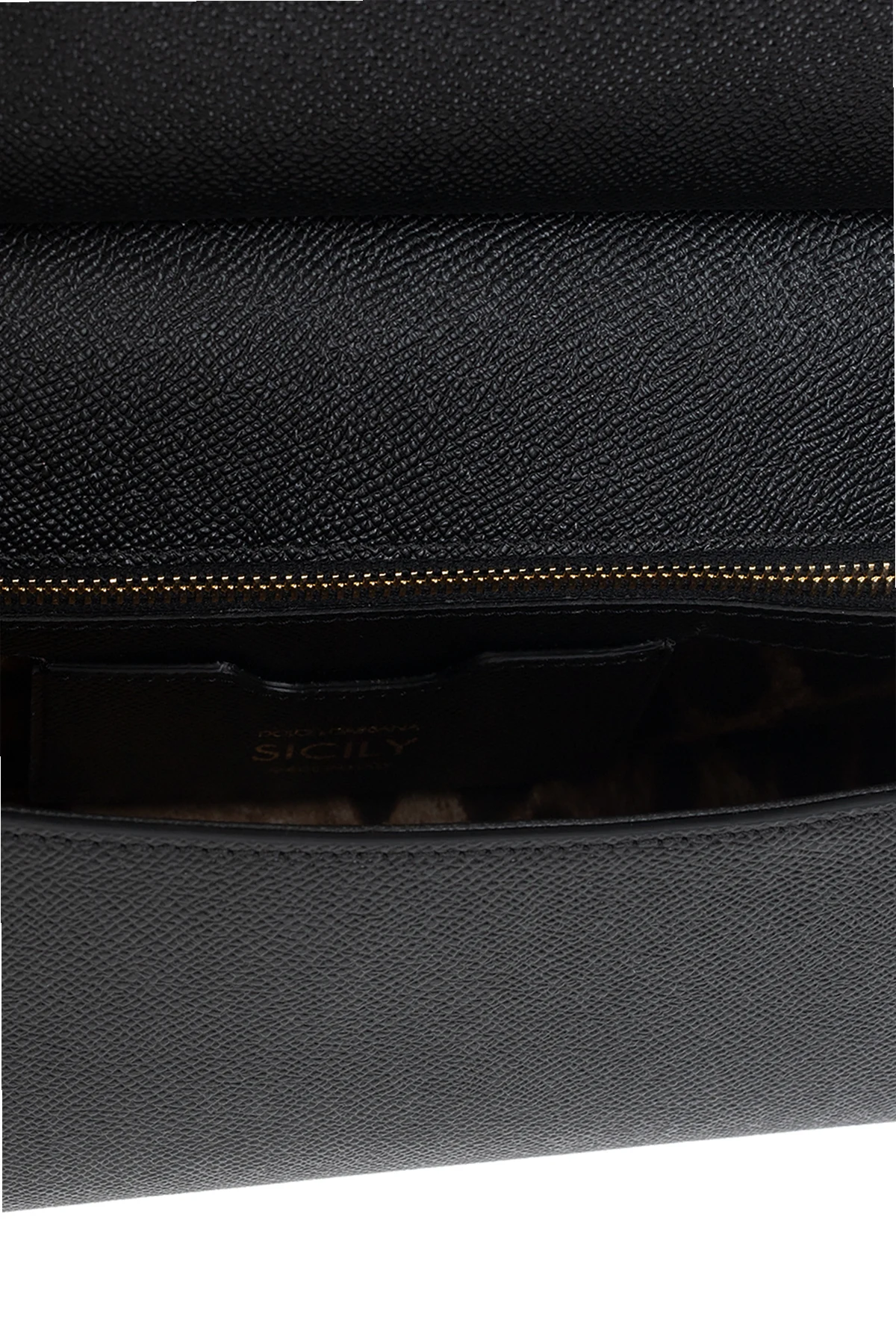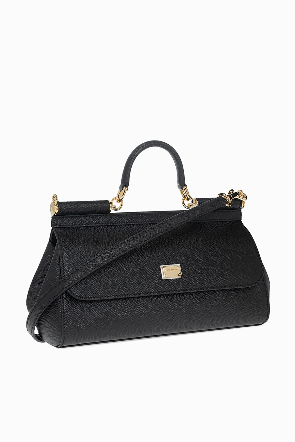 Czarna torba na ramię, model 'Sicily Medium' Dolce & Gabbana. Wykonana ze skóry cielęcej. Zamykana na zatrzask. Ozdobiona aplikacją z logo w kolorze złoto-srebrnym. Półokrągła rączka. Odpinany pas na ramię z możliwością regulacji długości. Wewnątrz komora, kieszeń wsuwana i zamykana na zamek. Metalowe wykończenie w kolorze złotym.