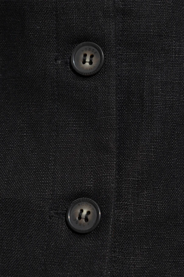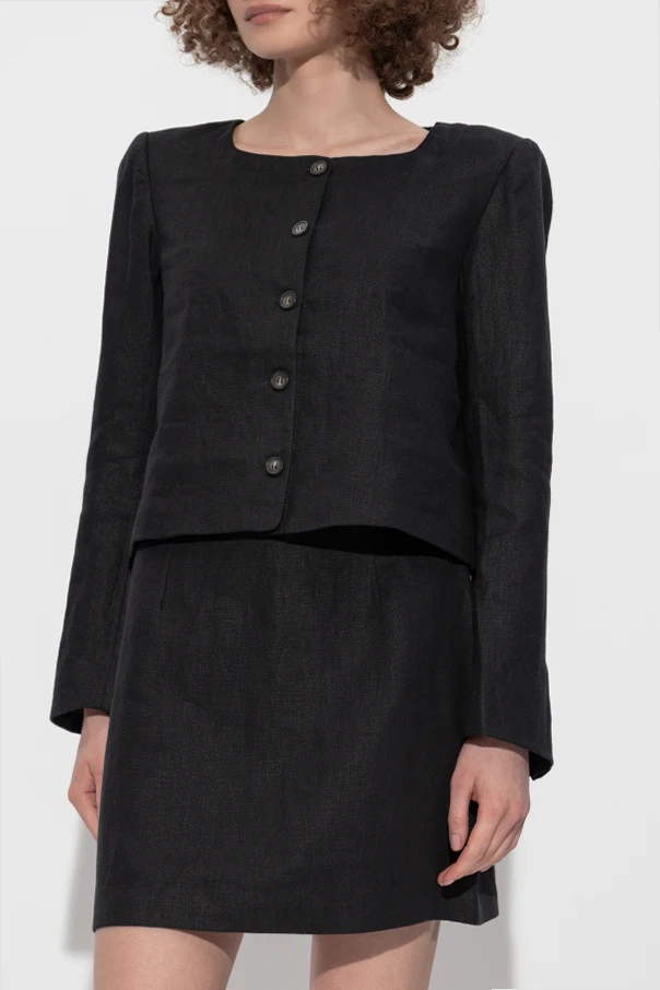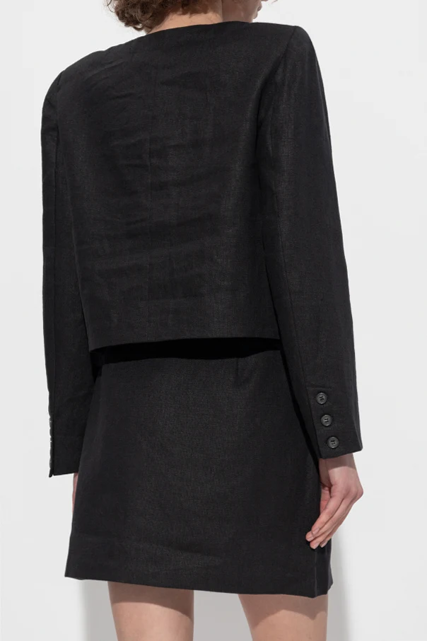 Unikatowa, jednolita tkanina wysokiej jakości lnu zachwyca delikatnym połyskiem oraz wyraźną, szlachetną fakturą. Kurtka jest gładka, bez zbędnych ozdób czy przeszyć, co pozwala wyeksponować jej precyzyjnie wykończone detale – zapięcie stanowi pięć dużych, czarnych guzików z dyskretnym logotypem, które podkreślają dbałość o każdy szczegół.
