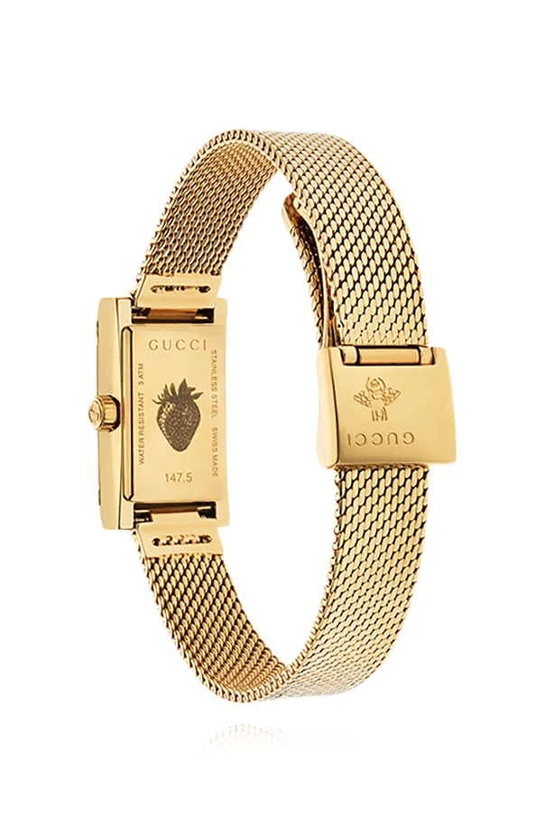 Na odwrocie koperty widnieje grawer z logo Gucci oraz artystycznym motywem ananasa, co stanowi o unikatowości tego modelu. Wodoodporność do 30 metrów i mechanizm kwarcowy zapewniają niezawodność w każdej sytuacji.