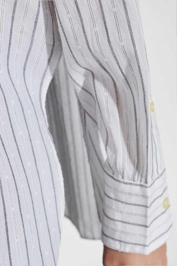 Finezyjny materiał o lekkiej, delikatnej strukturze – wykonany z wysokogatunkowej bawełny – zapewnia wyjątkowy komfort noszenia i przewiewność. Unikatowy wzór w postaci wyrazistych pasiastych prążków w odcieniach ciemnej szarości na czystobiałym tle nadaje koszuli niepowtarzalny, nowoczesny charakter.