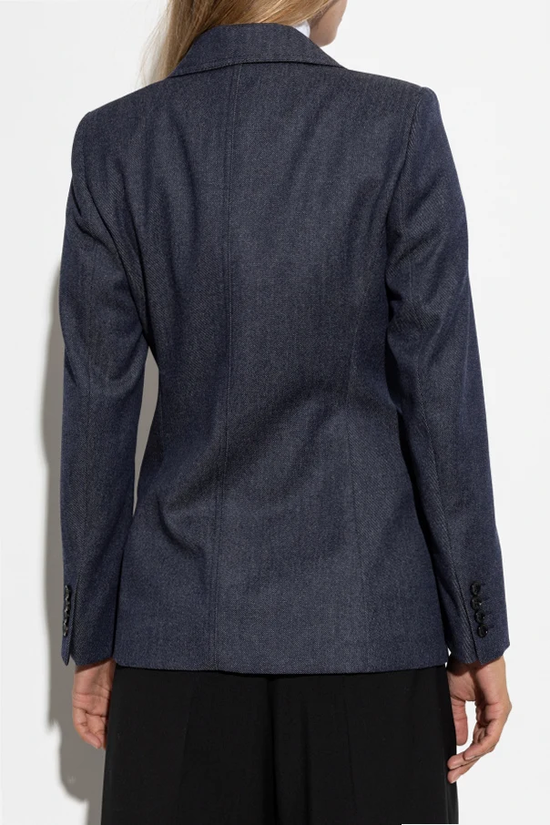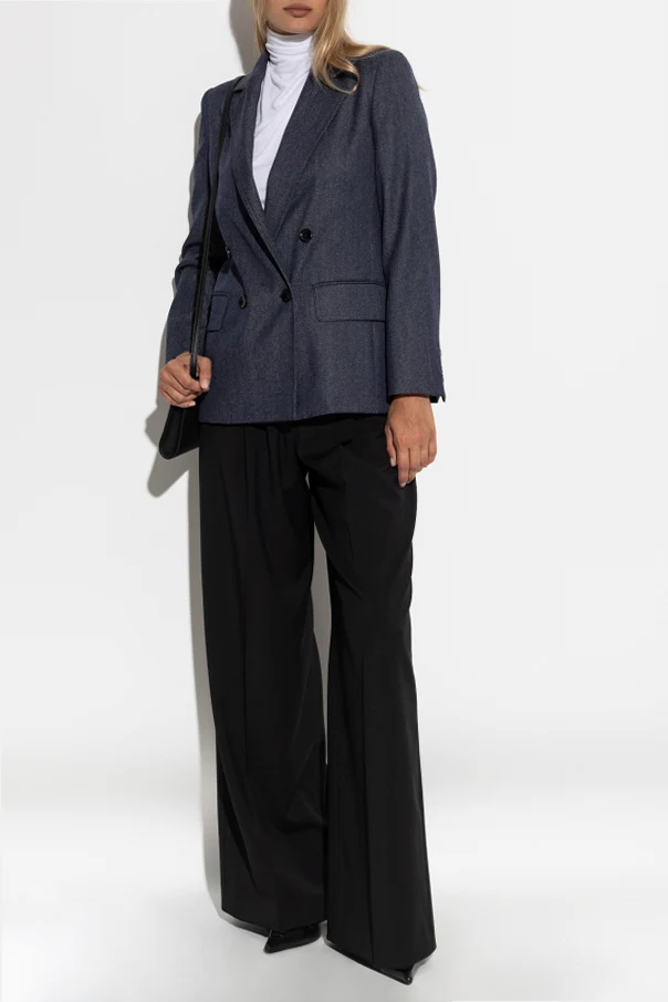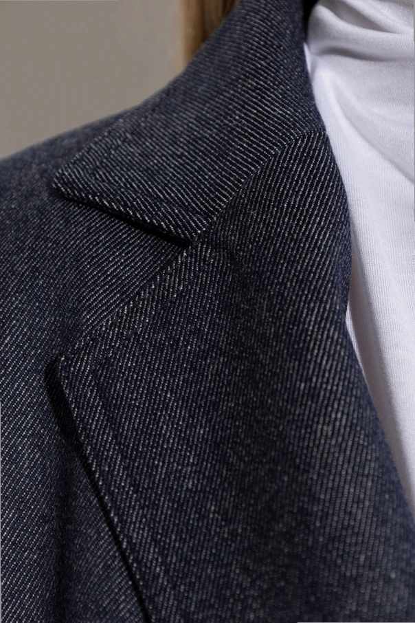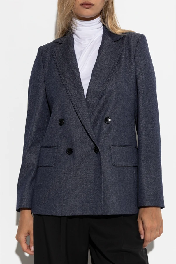 Dwurzędowy układ, ozdobiony czterema ciemnymi guzikami, harmonijnie współgra z szerokimi klapami oraz kieszeniami z patkami. Rzędy guzików na mankietach subtelnie akcentują dbałość o detale. Wszywka z nazwą „Max Mara” dopełnia całość, potwierdzając ekskluzywny rodowód marynarki.