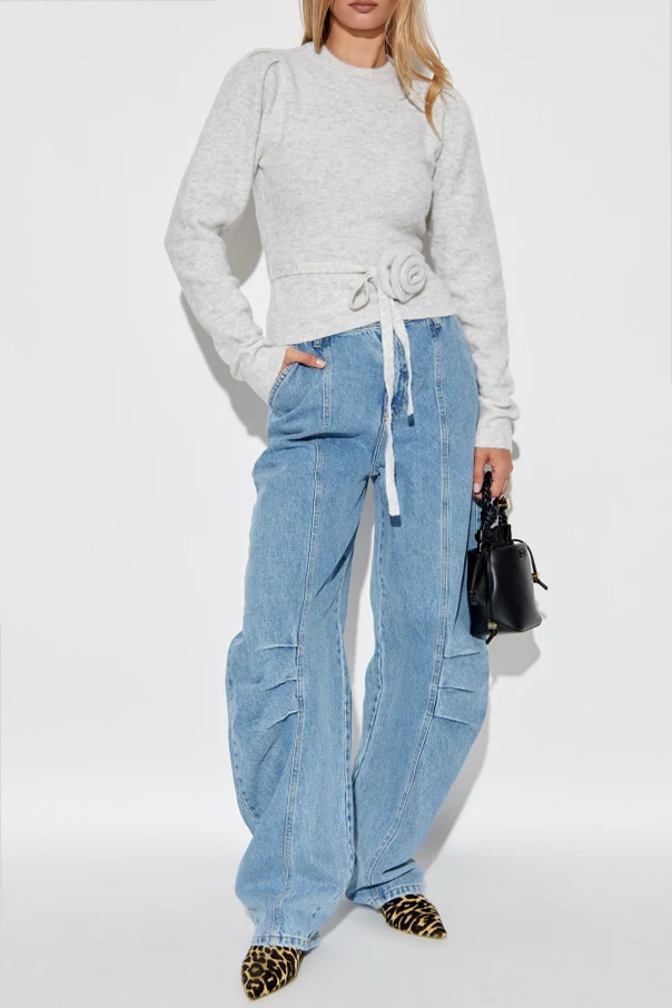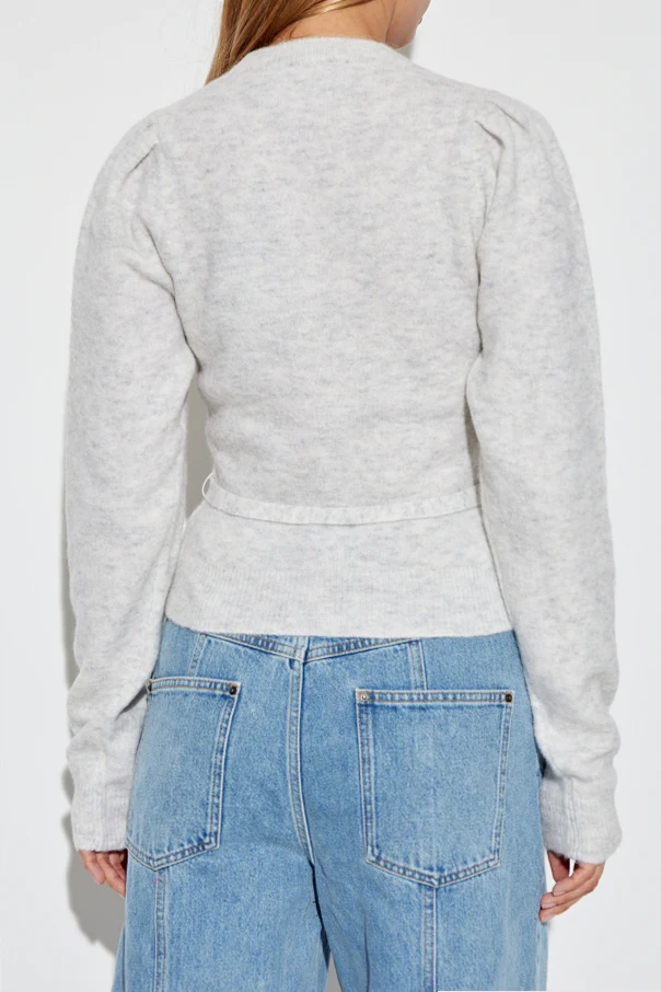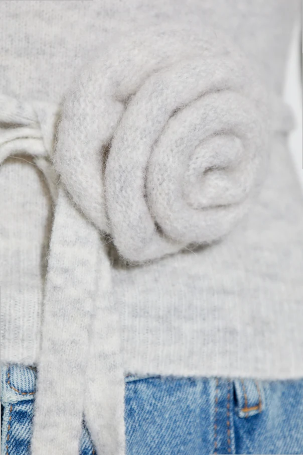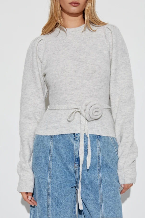 Wełniany sweter marki ROTATE ujmuje subtelnością i niepowtarzalnym wdziękiem. Delikatny, jasnoszary odcień w połączeniu z dopasowanym fasonem o lekko rozszerzanym dole oraz zmysłowych, bufiaste ramiona tworzą harmonijną sylwetkę, podkreślającą kobiecość i naturalną elegancję. Wysokogatunkowa, miękka wełna z domieszką alpaki przenosi komfort użytkowania na wyżyny, oferując przyjemnie puszystą fakturę oraz aksamitną lekkość.