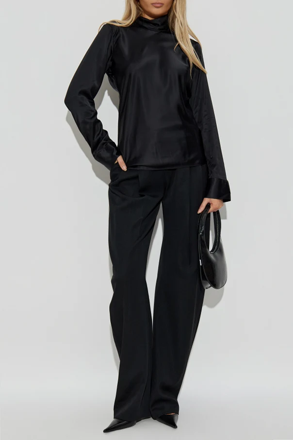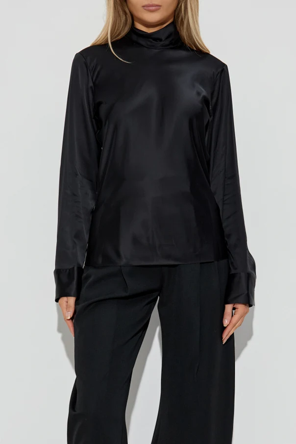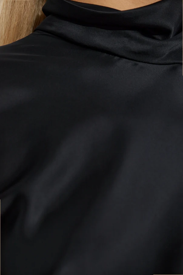 Top ze stójką autorstwa domu mody Courrèges stanowi wykwintne połączenie ponadczasowej elegancji z wyrafinowaną prostotą formy. Jego geometryczna linia została podkreślona lekko pudełkowym krojem i minimalistycznym wykończeniem – bez zbędnych przeszyć czy widocznych logotypów.