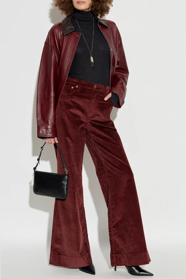 Spodnie sztruksowe z rozszerzanymi nogawkami marki Rag & Bone to wyrafinowana propozycja dla kobiet ceniących elegancję przeplataną nutą swobodnej nonszalancji. Utrzymane w intensywnym odcieniu bordo, wykonane zostały z aksamitnego sztruksu o wyrazistej, pionowej strukturze, która subtelnie wzbogaca głębię barwy oraz czyni ten model niepowtarzalnie wyrafinowanym.