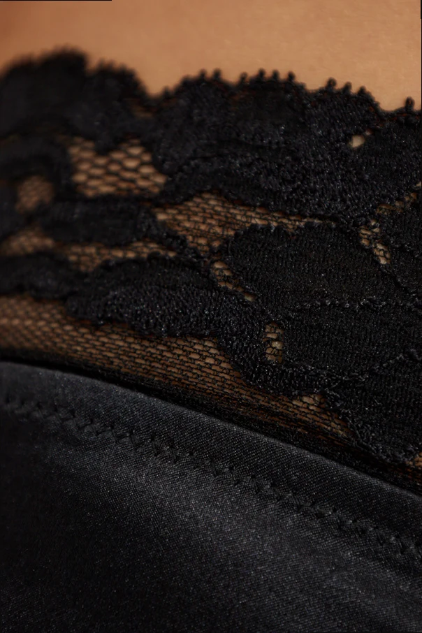Główna część produktu została wykonana z gładkiego jedwabiu o subtelnym połysku, który pieści skórę, oferując uczucie luksusu i zmysłowej lekkości. W górnej partii majtek uwagę przykuwa szeroki pas z czarnej, przezroczystej koronki o florystycznym wzorze, będącej efektownym i rozpoznawalnym akcentem bez zbędnych zdobień czy widocznych logo.