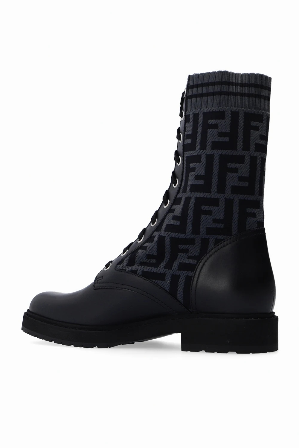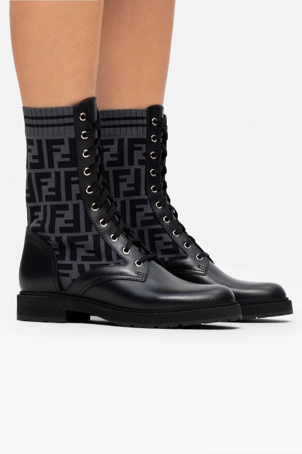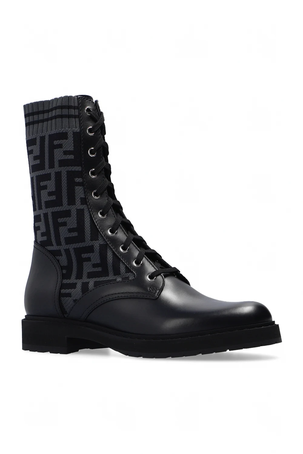 Czarno-szare, sznurowane trapery ze skarpetą Fendi. Wykonane ze skóry. Ozdobione wyszytym logo. Czarna, gumowa podeszwa.