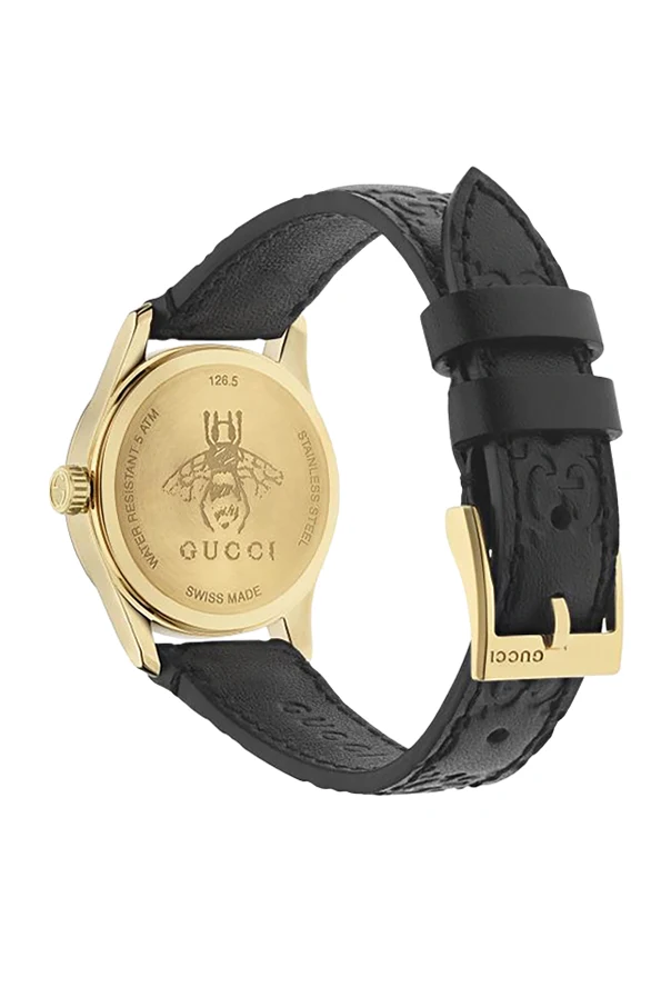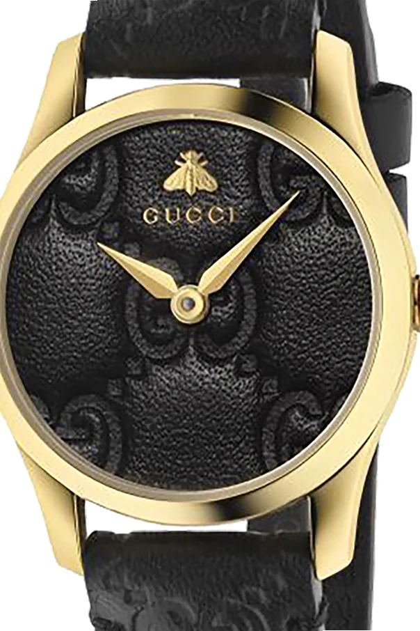 Czarny zegarek, model 'G-Timeless' Gucci. Wykonany ze stali nierdzewnej oraz lakierowanej skóry z wytłoczonym logo w kolorze czarnym. Zapinany przy pomocy klamry z wygrawerowanym logo. Tarcza z logo wysadzana dekoracyjnymi elementami w kolorze złotym. Mechanizm kwarcowy. Wodoodporny do 50 metrów. Metalowe elementy w kolorze złotym.