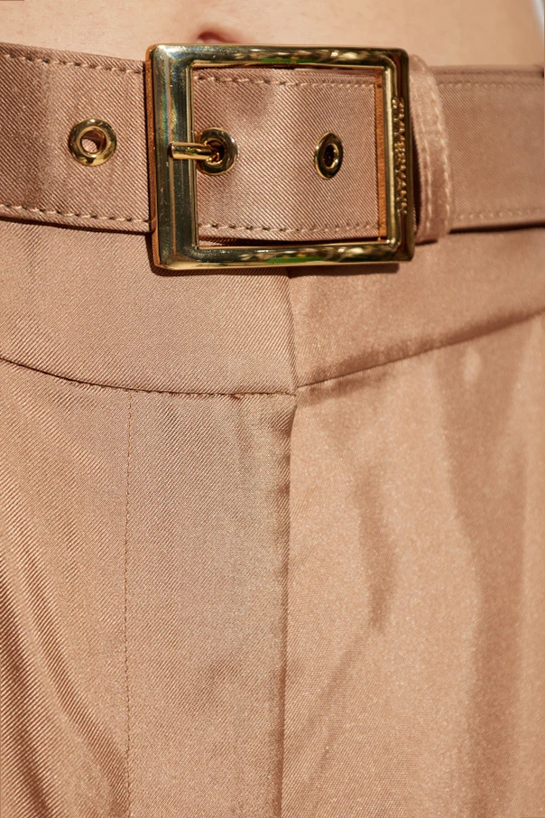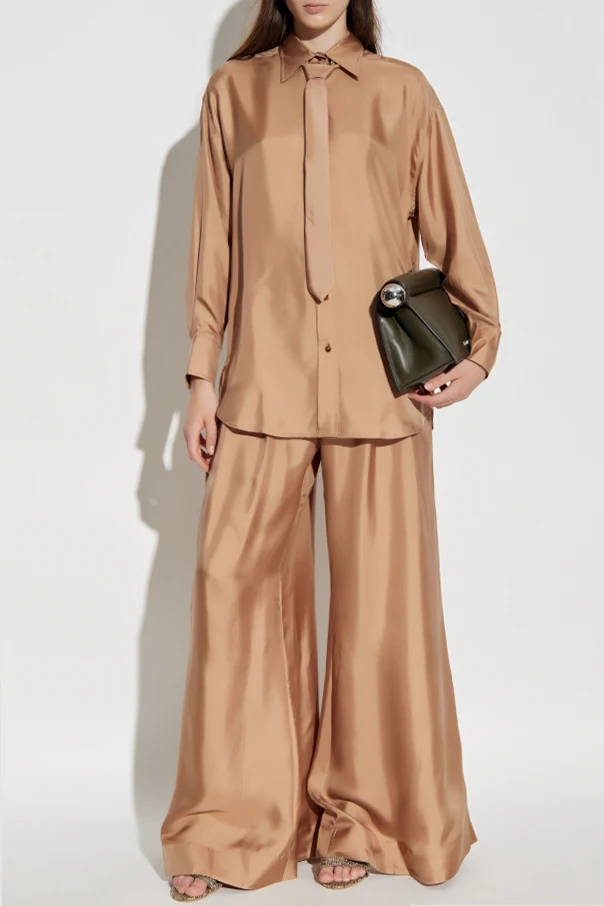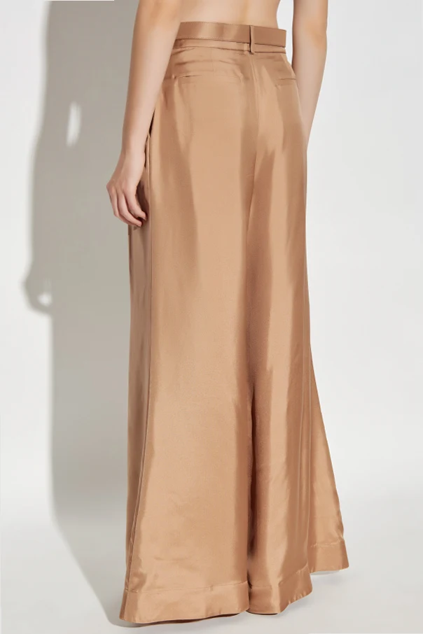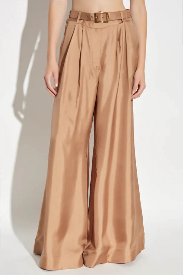 Jedwabne spodnie z szerokimi nogawkami sygnowane przez markę Zimmermann, to ukłon w stronę wyrafinowanej elegancji i bezkompromisowego stylu. Wykonane z luksusowego, delikatnie połyskującego jedwabiu, zachwycają niepowtarzalnym, miękkim układem na sylwetce. Beżowy odcień w połączeniu z minimalistycznym wykończeniem podkreśla kunsztowność oraz subtelną nutę ponadczasowości.