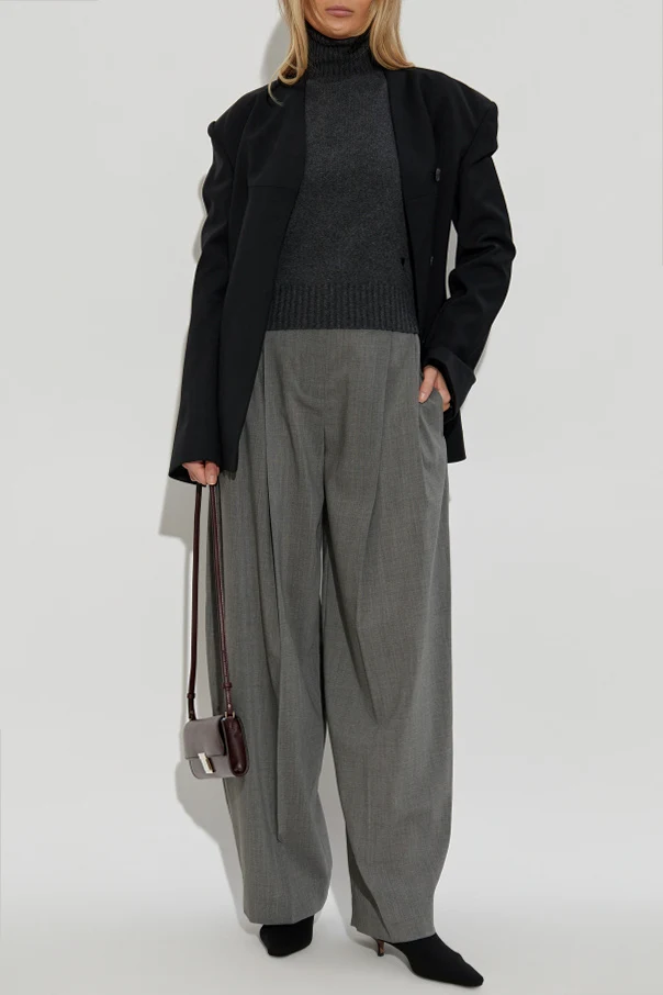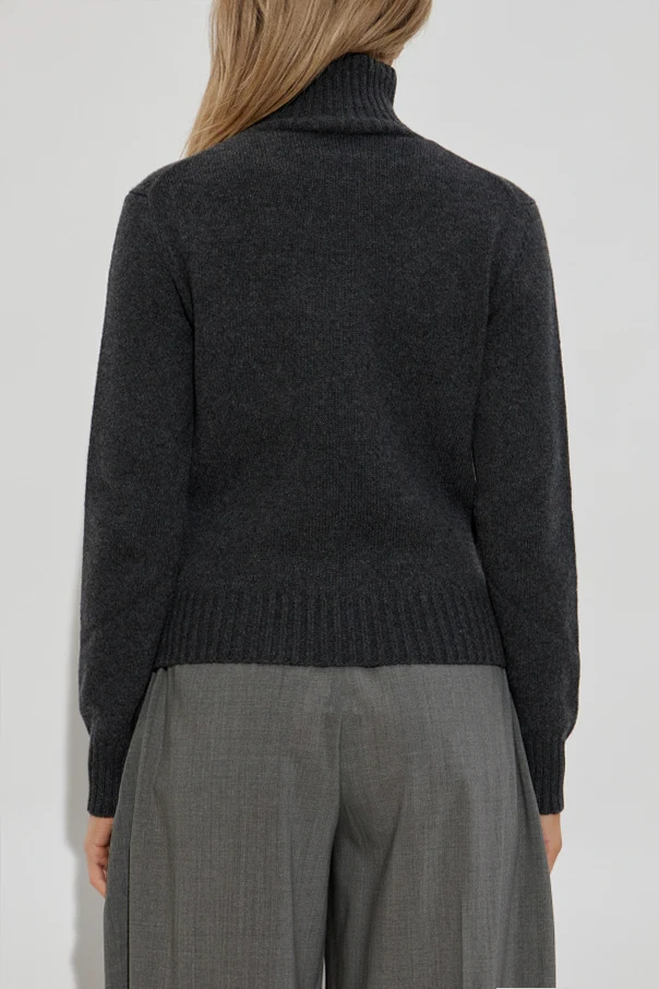 Wyróżnia go dzianina z najwyższej jakości kaszmiru o subtelnie puszystej strukturze, która emanuje zmysłową miękkością, delikatnie lśniąc w świetle. Wysoki, wywinięty kołnierz typu turtleneck oraz wyraźne, ściągaczowe wykończenia mankietów i dołu subtelnie akcentują ekskluzywny charakter projektu. Całość wieńczy dyskretne, tonalne logo projektanta, wyszywane w dolnej przedniej części, będące ukłonem w stronę paryskiego minimalizmu.