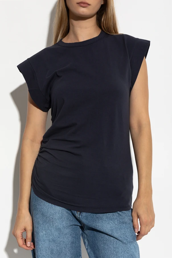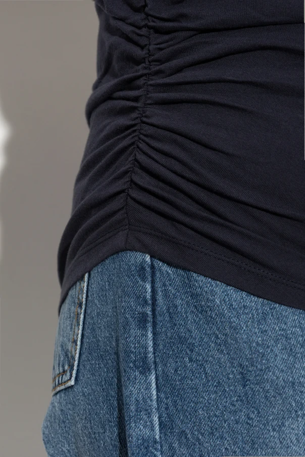 Wyróżnikiem jest również zmysłowe marszczenie materiału na lewym boku — designerski akcent o nieoczywistej asymetrii, harmonizujący z klasycznym okrągłym dekoltem obszytym jednolitą lamówką.