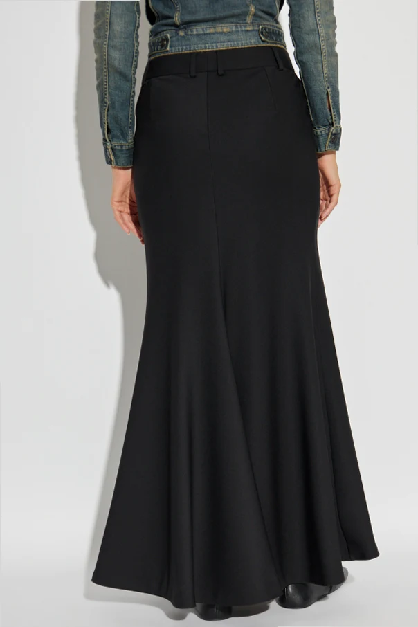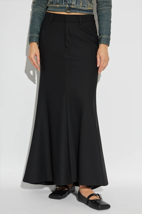 Wełniana spódnica od znakomitego domu mody Balenciaga to kwintesencja doskonałego krawiectwa, osadzonego w tradycji haute couture. Model ten wyróżnia się długością sięgającą kostek , dopracowanym krojem syrenki oraz wysublimowaną linią, którą podkreślają dyskretne, pionowe przeszycia modelujące sylwetkę. Subtelnie rozkloszowany dół spódnicy nadaje całości wyjątkową lekkość i szlachetność.