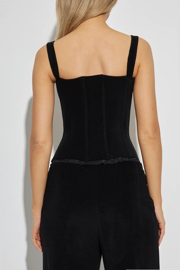 Top bez rękawów marki Balenciaga to kwintesencja subtelnej elegancji, wyróżniająca się dopracowanym, gorsetowym krojem, który z finezyjną precyzją podkreśla talię. Szerokie ramiączka oraz lekko wyprofilowany dół nadają mu wyjątkowy i nowoczesny charakter.