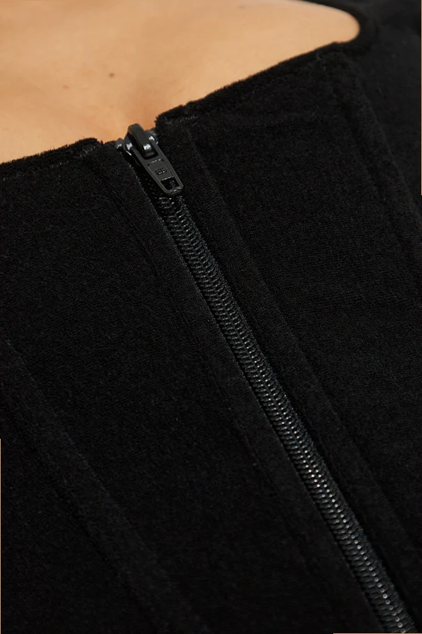 Starannie dobrany materiał o miękkiej, lekko welurowej strukturze otula sylwetkę, zapewniając niepowtarzalny komfort i szlachetność noszenia. Dopieszczone szwy tworzą usztywniający detal, który buduje doskonałą sylwetkę oraz wytrzymałość, a zamek błyskawiczny na całej długości przodu nadaje topowi zdecydowaną, użytkową nutę.