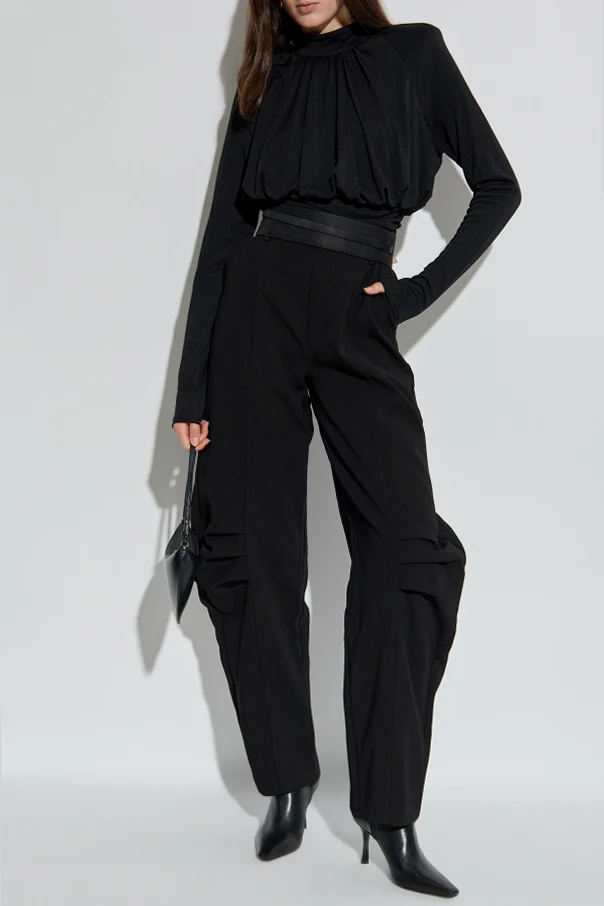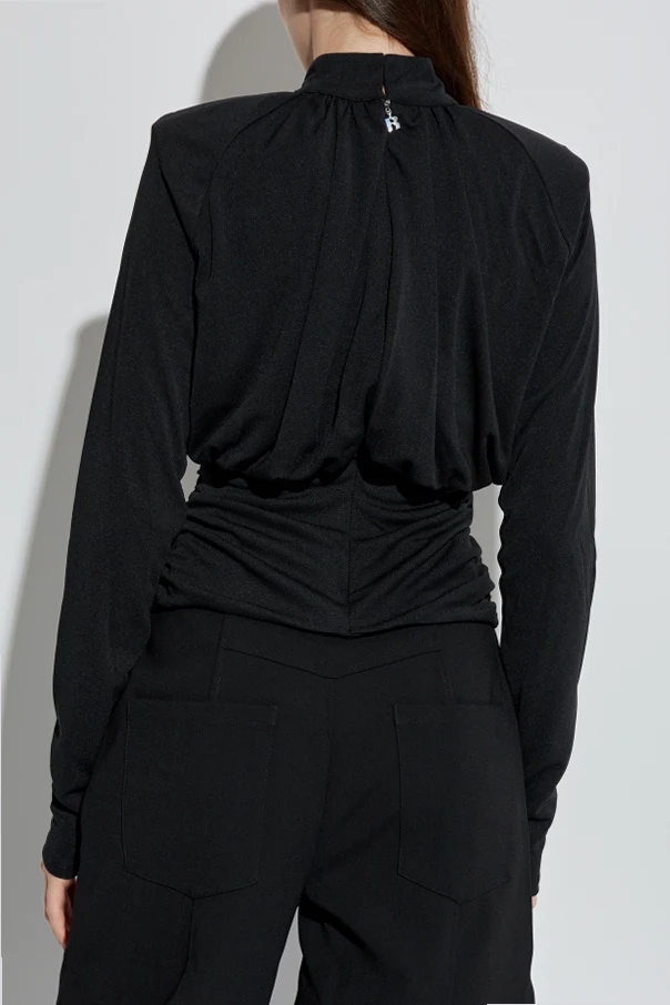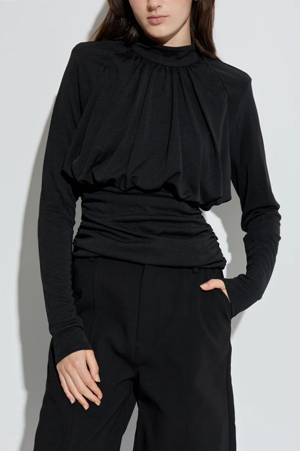 Top z długim rękawem marki ROTATE to przykład wyrafinowania, w którym harmonia klasycznej czerni zostaje przełamana zmysłową nowoczesnością. Przylegający fason podkreśla talię, a efektowne, obfite marszczenia kreują wyrazistą objętość na górze, subtelnie eksponując sylwetkę. Starannie zakładane partie na dole topu układają się w innowacyjny kształt, łącząc aktualne trendy z ponadczasową elegancją.