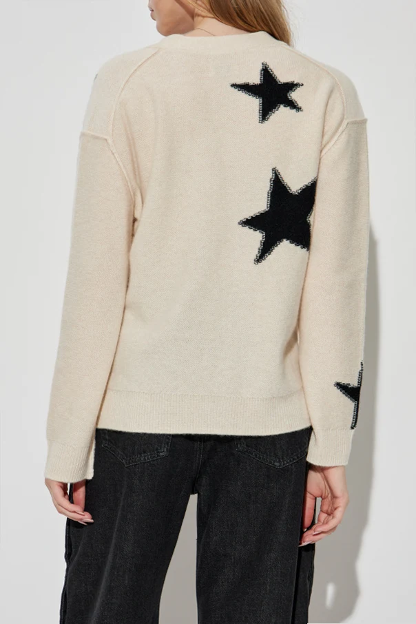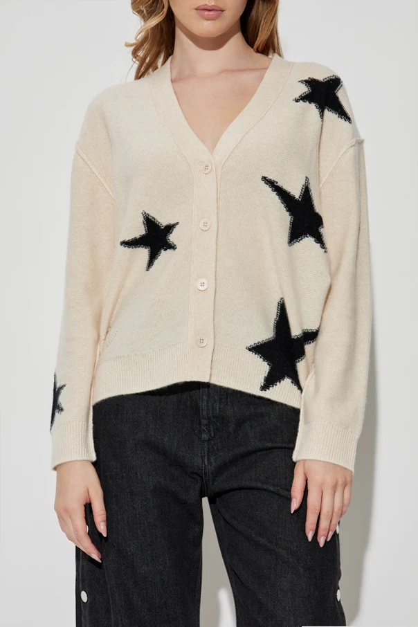 Kaszmirowy sweter „Mirkaz” to kwintesencja wysublimowanej elegancji i nowoczesnego wyrafinowania. Utrzymany w kremowej tonacji, zachwyca prostotą lekko oversize'owego kroju oraz subtelnie opuszczoną linią ramion. Unikalny akcent stanowią duże, nieregularne, czarne gwiazdy z kontrastowym, artystycznie postrzępionym konturem, misternie rozmieszczone na całej powierzchni swetra.