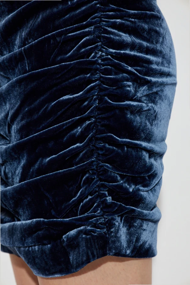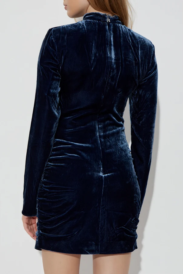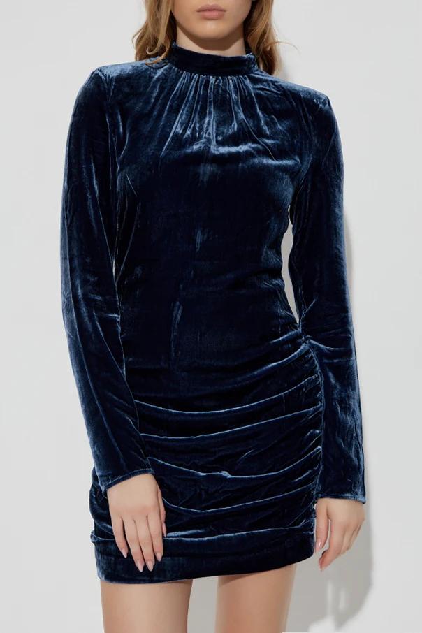 Welurowa sukienka z ekskluzywnej kolekcji marki ROTATE to kwintesencja wyrafinowanej elegancji i współczesnego szyku. Jej krótki, dopasowany fason subtelnie podkreśla kobiecą sylwetkę, zaś długie, proste rękawy i lekko marszczony stójkowy kołnierz emanują dystynkcją. Aksamitny materiał, będący harmonijnym połączeniem wiskozy i jedwabiu, przywodzi na myśl szlachetność oraz ponadczasową klasę. Delikatne marszczenia na biodrach i dolnej części sukienki, w połączeniu z gładką fakturą i naturalną grą światła, tworzą wyjątkowy efekt głębi. Brak wyrazistego wzoru pozwala docenić subtelność kolorystyki oraz doskonałe wykończenie.