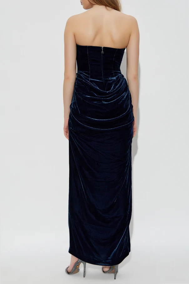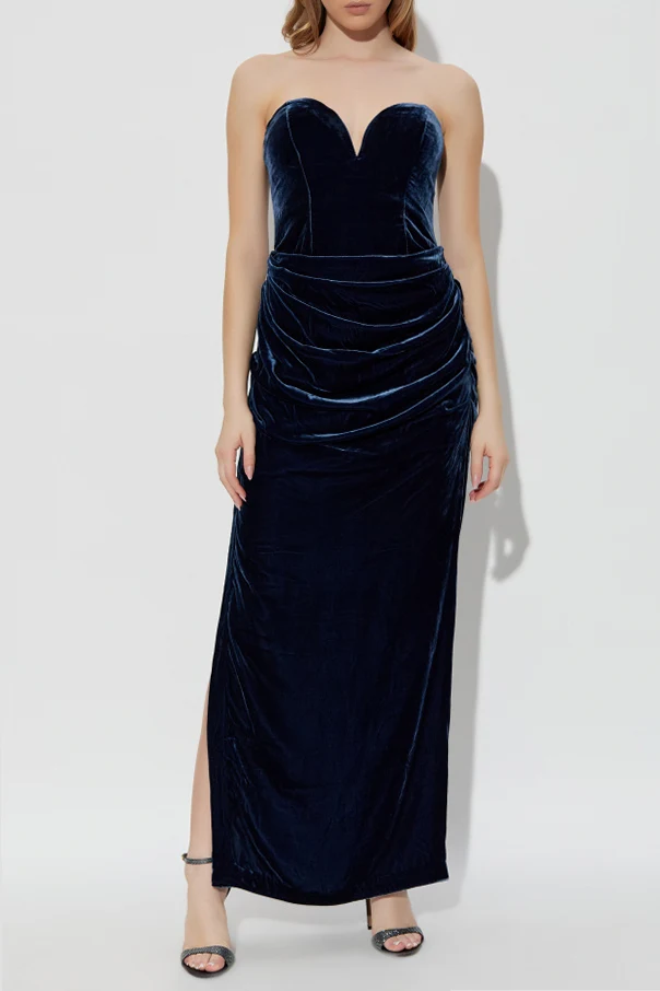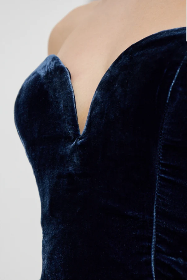 Welurowa sukienka marki ROTATE to prawdziwy klejnot współczesnej garderoby, budujący aurę wyrafinowania i subtelnej zmysłowości. Dopasowany, gorsetowy fason o długości maxi zachwyca sercowatym dekoltem z dyskretnym wcięciem, eksponując dekolt w wyjątkowo elegancki sposób.