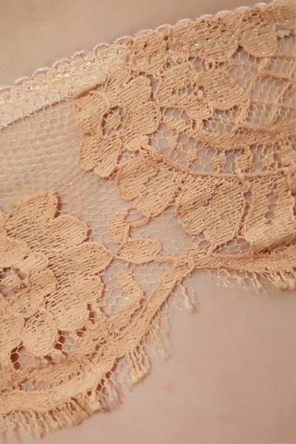 Stringi z koronkowymi wstawkami marki Dsquared2 łączą w sobie wyrafinowaną estetykę z ponadczasową subtelnością. Niski stan i klasyczny, trójkątny przód harmonijnie współgrają z minimalnym tyłem stworzonym z gładkiej, miękkiej satyny o delikatnym połysku. Zmysłowy przód oraz boki zdobi bogata, półprzezroczysta koronka z finezyjnym, kwiatowym motywem oraz nieregularnie wykończonymi krawędziami, zapewniając niepowtarzalny efekt wizualny.