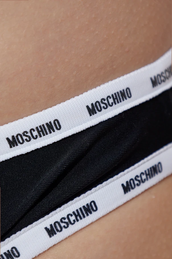 Czarne tło delikatnie przełamują białe, kontrastowe wykończenia oraz charakterystyczny, elastyczny pas z wyrazistym logo „MOSCHINO” , przyciągając spojrzenie i podkreślając ekskluzywny styl produktu.