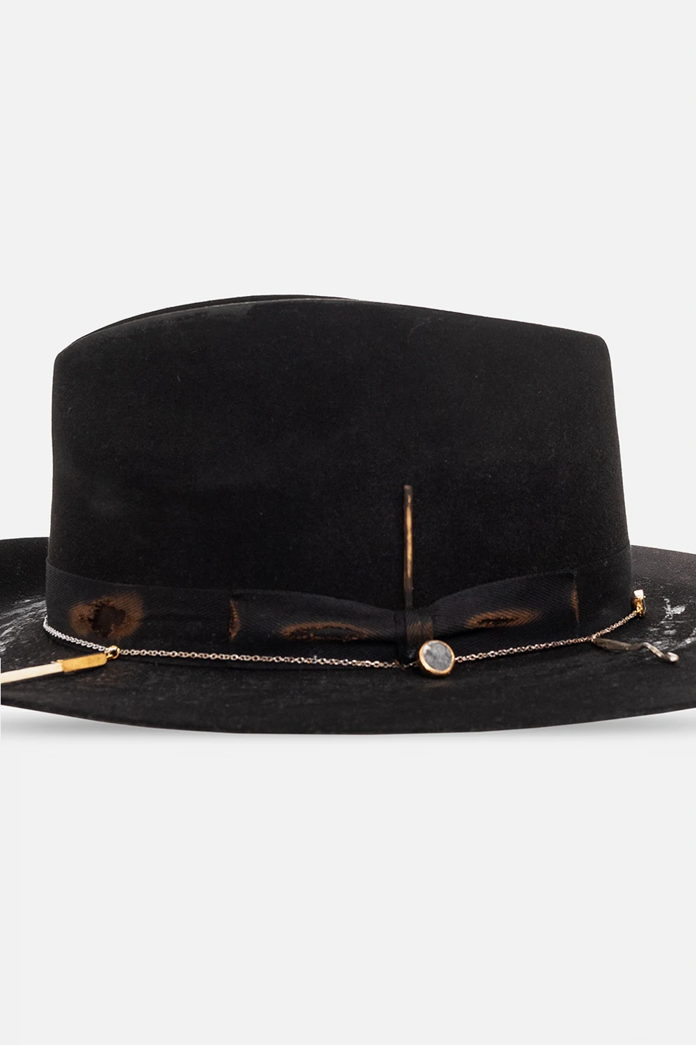 Czarny kapelusz z efektem ‘vintage’, model ‘Avedon’ Nick Fouquet. Wykonany z filcu. Ozdobiony łańcuchem, paskiem, metalowymi aplikacjami i charakterystyczną zapałką.