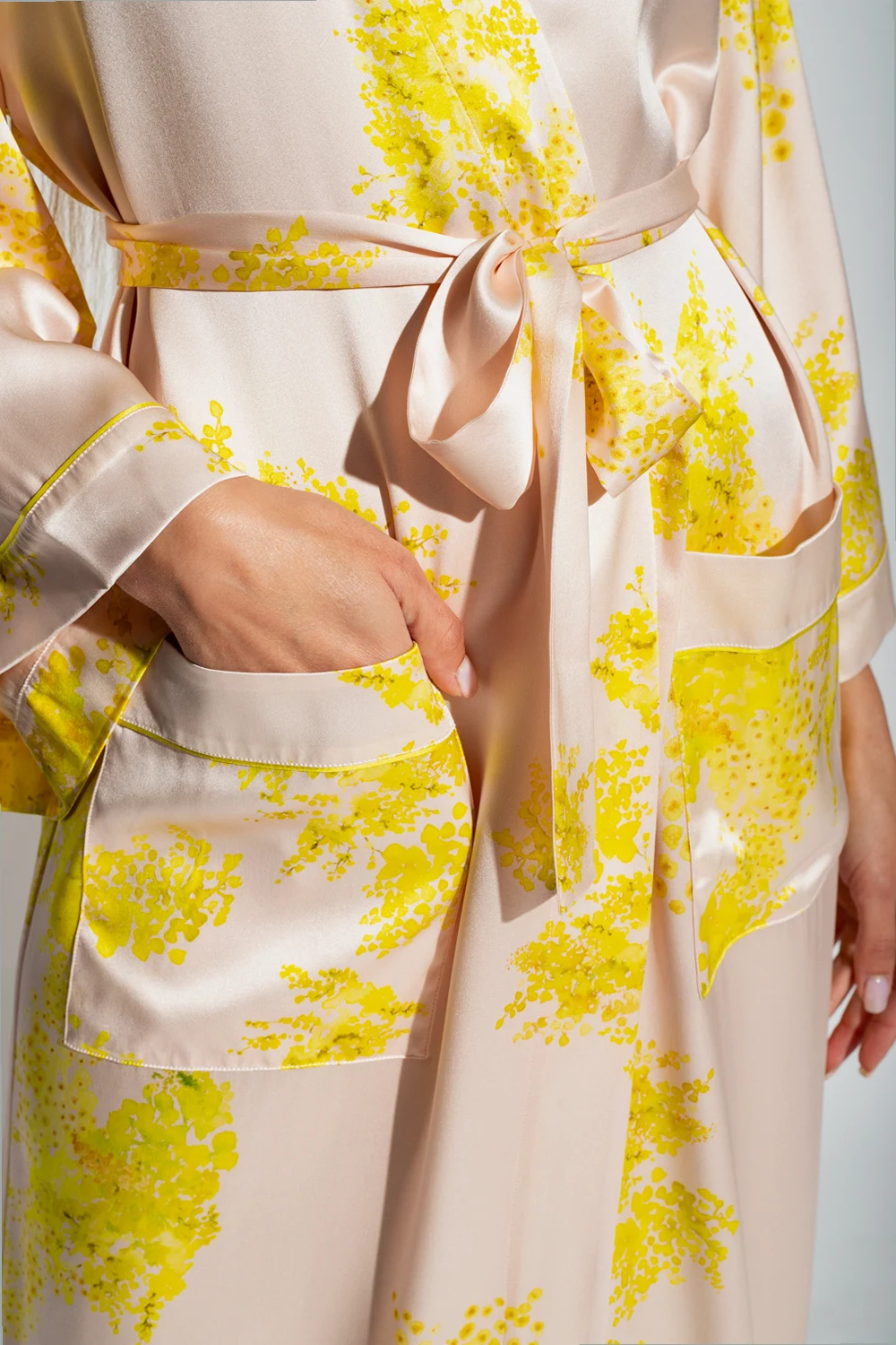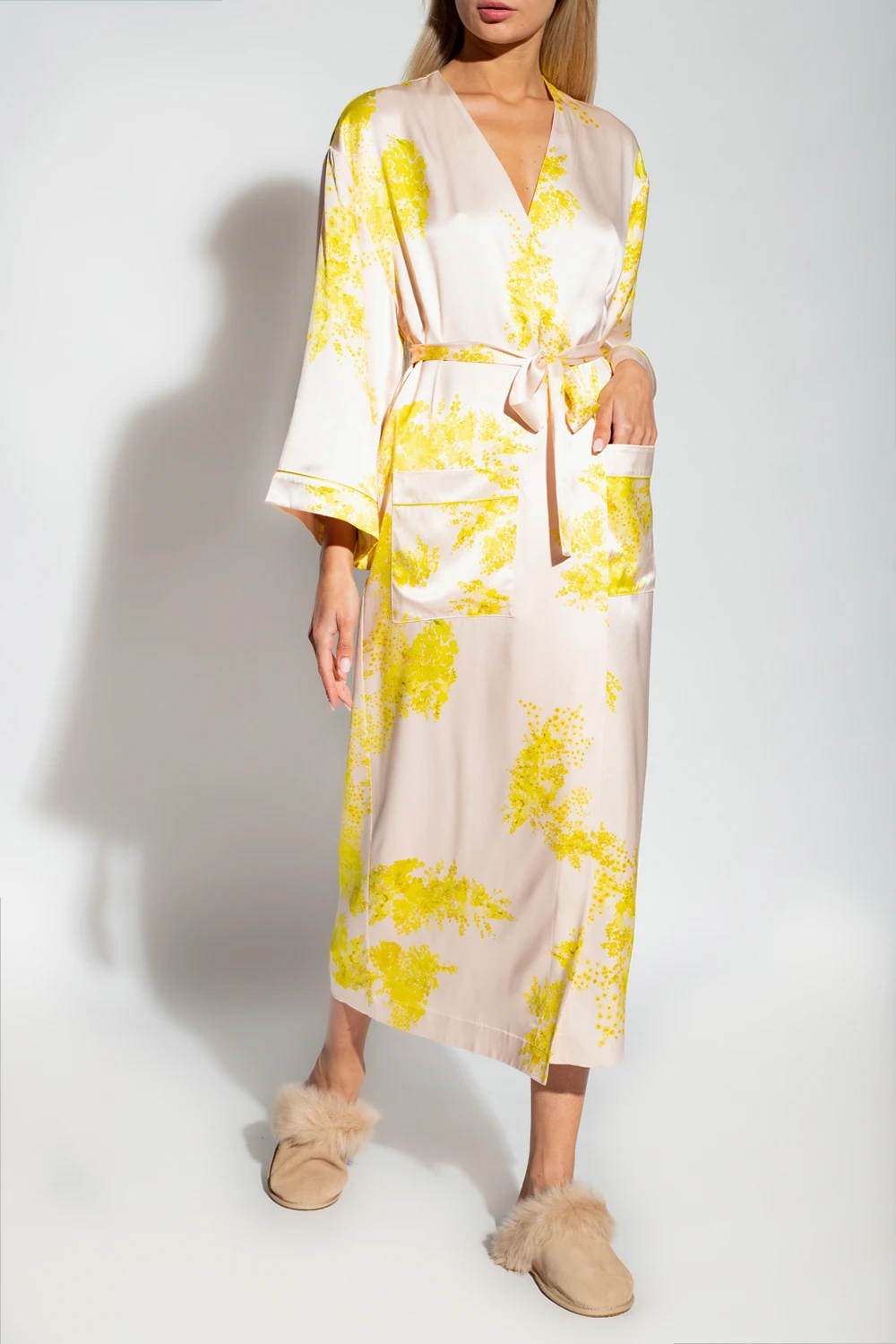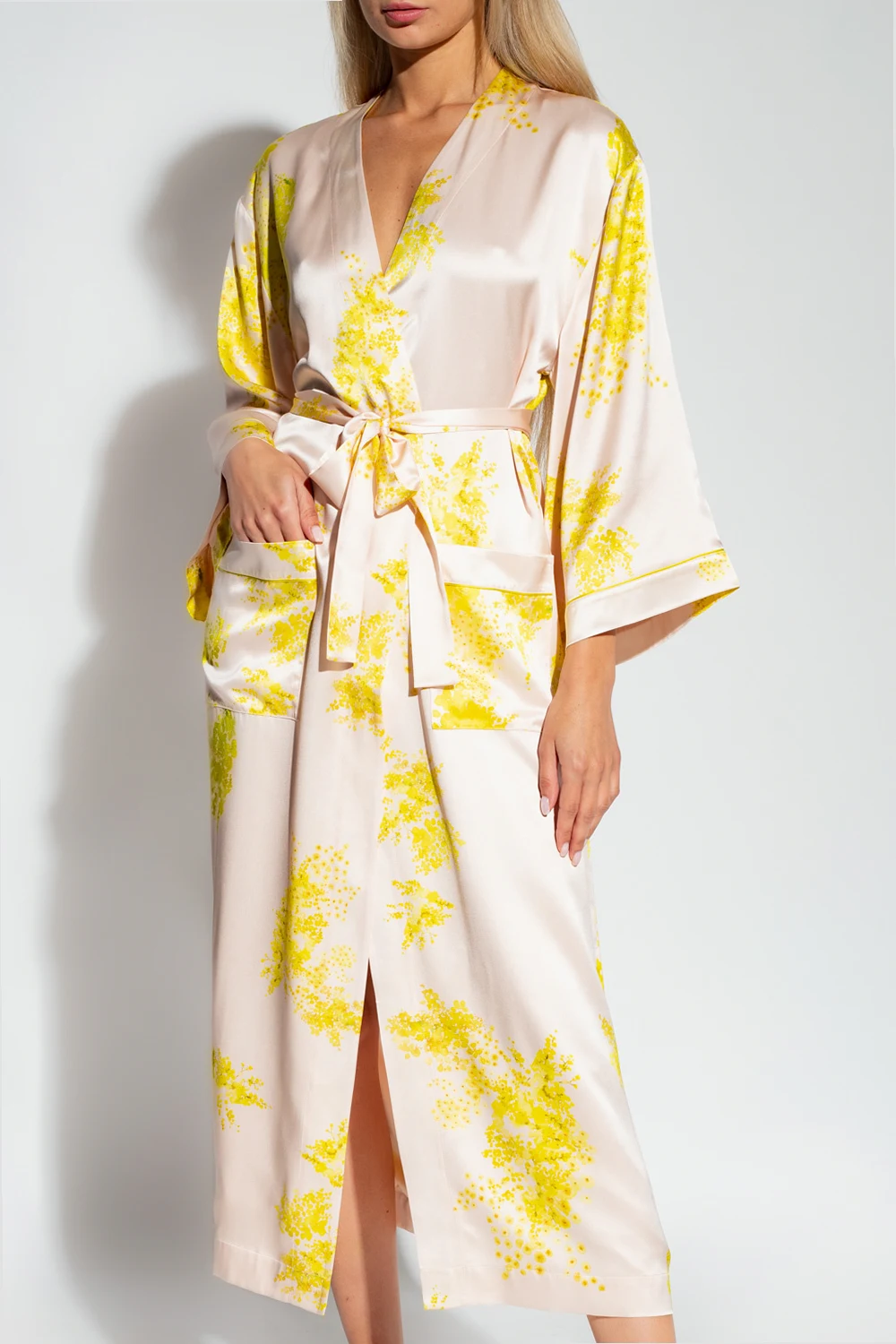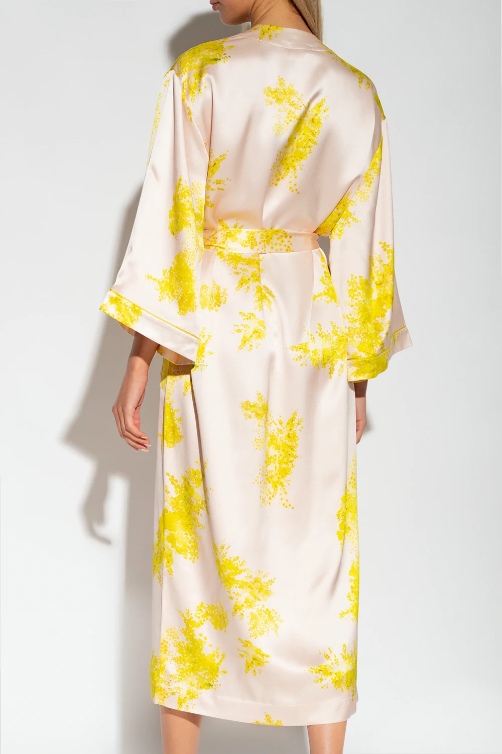 Jasnoróżowy szlafrok, model ‘Imperial’ Eres. Wykonany z jedwabiu. W talii wiązany paskiem. Ozdobiony żółto-zielonym, nadrukowanym wzorem ‘Mimosas’. Rękawy o długości trzy czwarte.