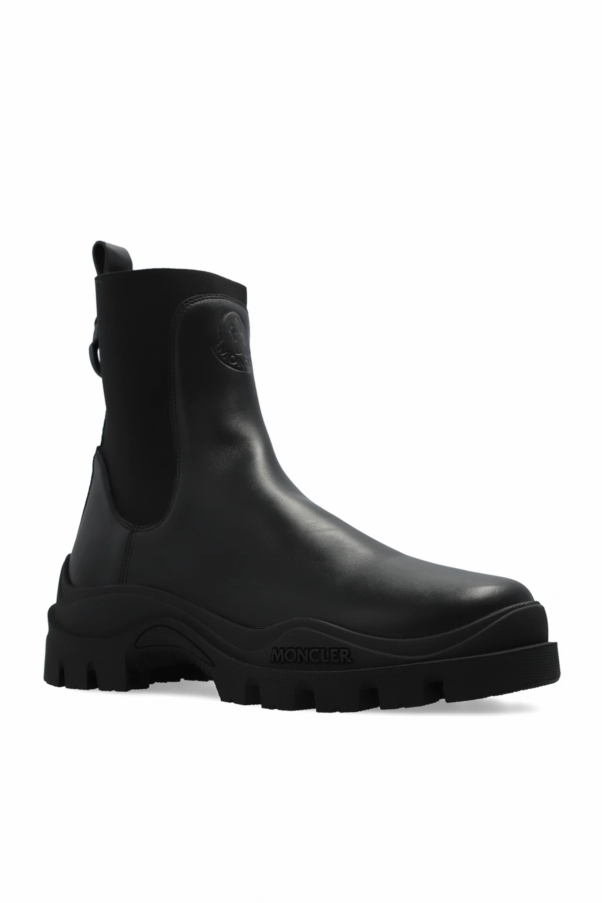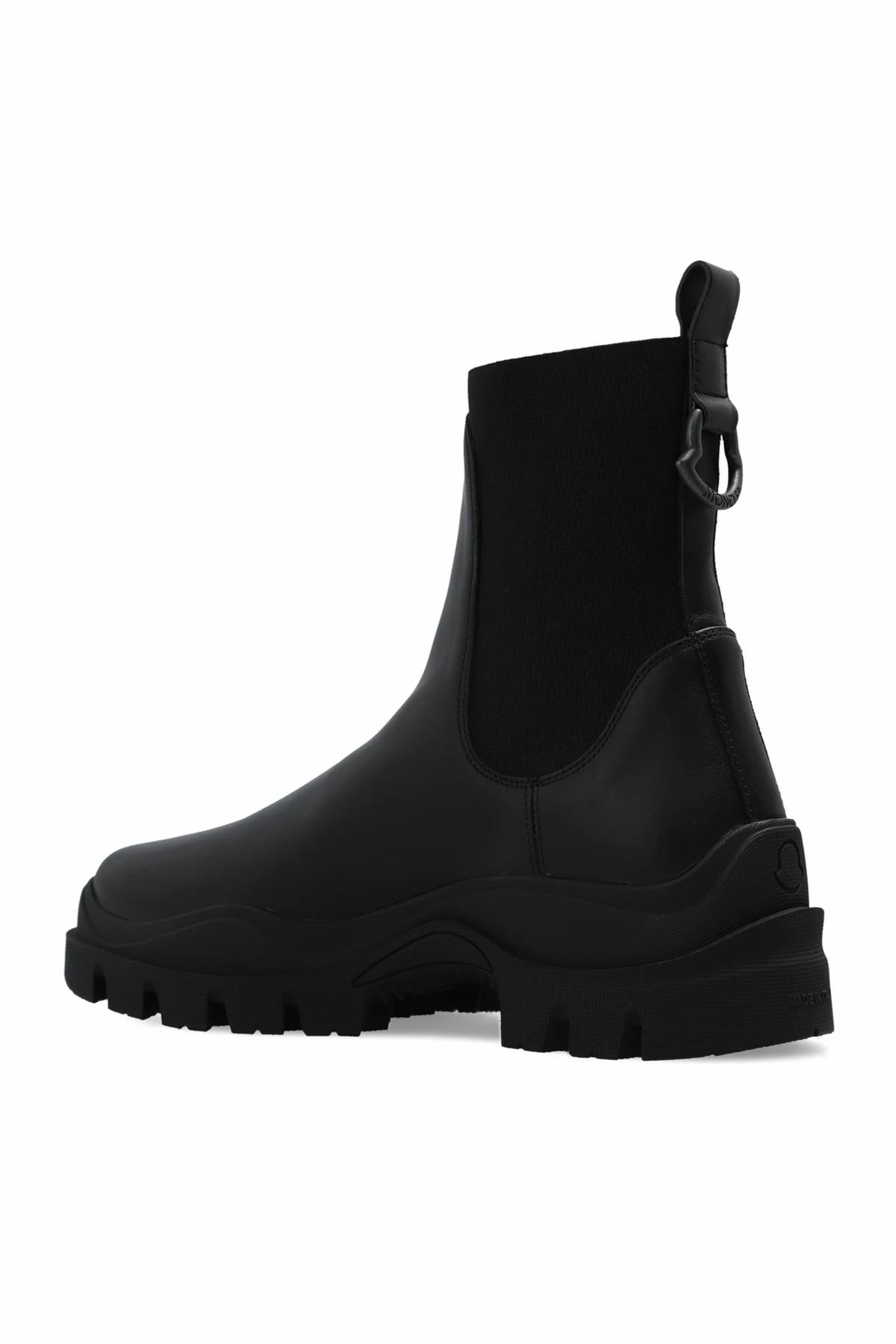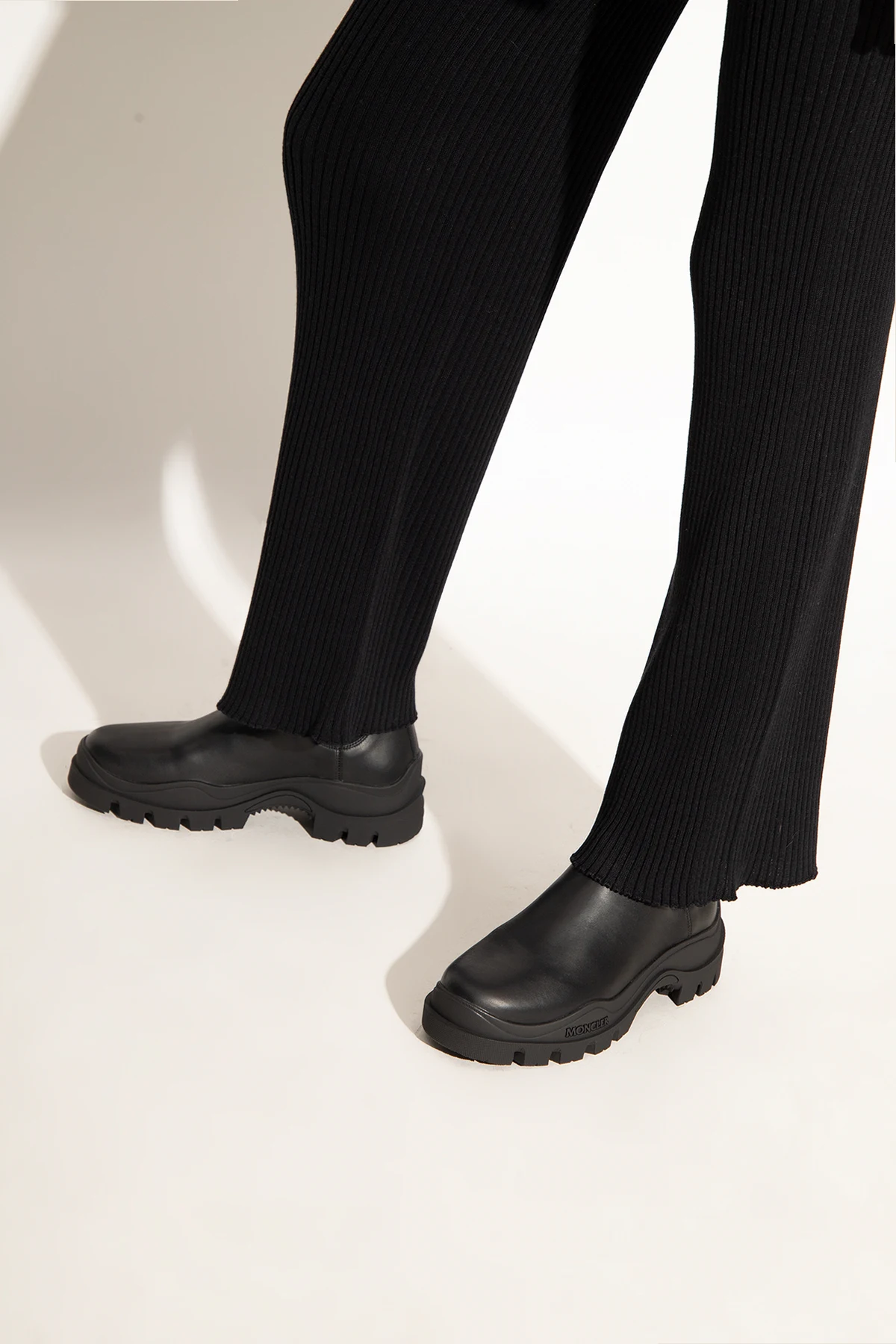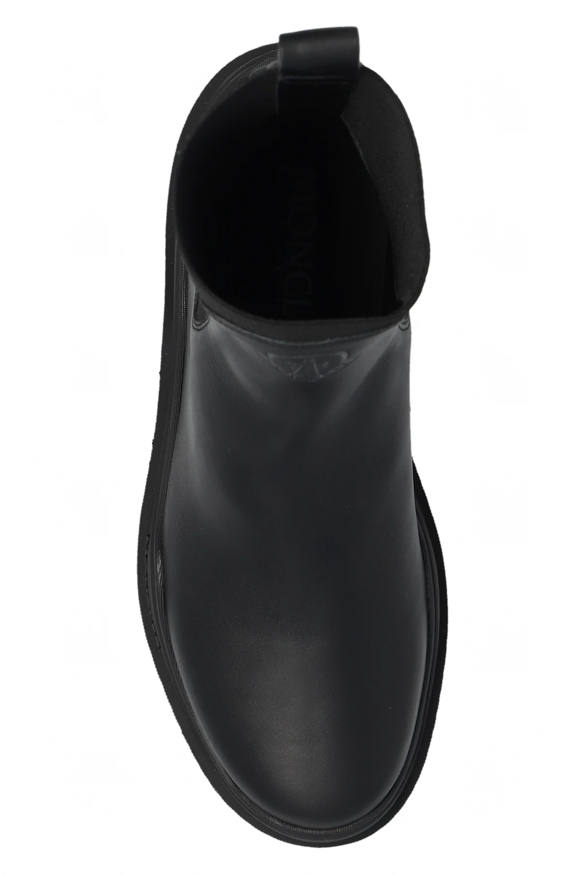 Czarne, wsuwane sztyblety, model ‘Larue’ Moncler. Wykonane ze skóry. Po bokach taśma elastyczna. Migdałowy nosek. Czarna, gumowa podeszwa.