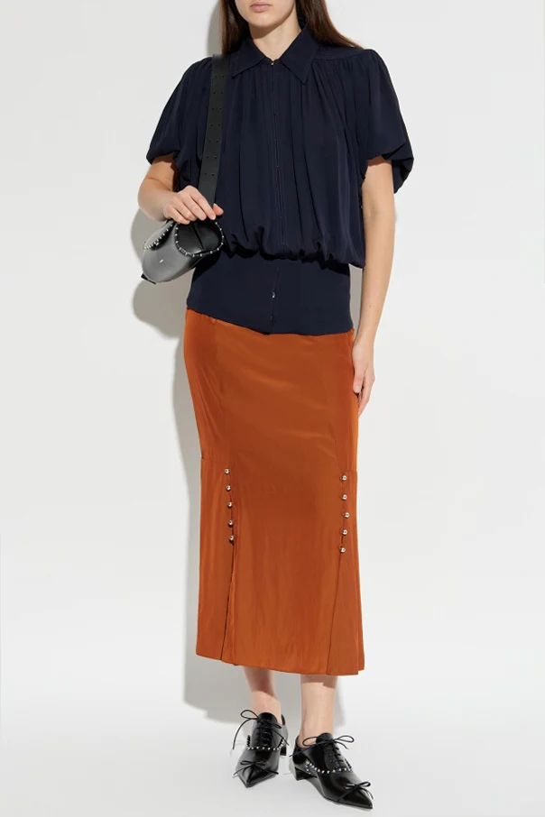 Spódnicę wyróżniają starannie rozmieszczone rozcięcia po bokach, ozdobione rzędami metalicznych, kulistych guzików, które stanowią luksusowy i designerski detal. Całość zachwyca subtelnością oraz kunsztem rzemiosła.