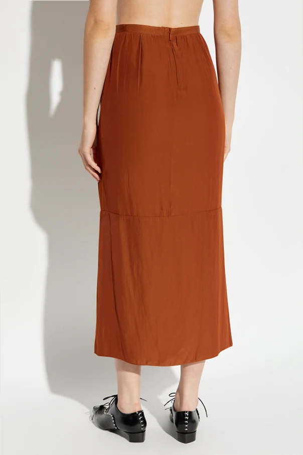 Długa spódnica z rozcięciami od Lanvin to prawdziwa esencja paryskiej elegancji, zainspirowana ponadczasowym dziedzictwem najstarszego domu mody haute couture. Prostolinijny fason o wysokim stanie oraz lekko rozszerzany dół subtelnie akcentują sylwetkę, zapewniając wyjątkowy komfort i swobodę ruchu. Gładka, brązowa tkanina o matowym wykończeniu miękko spływa po ciele, zaś wyszukany materiał – delikatny, lejący się poliester – gwarantuje trwałość oraz wyrafinowany wygląd na każdą okazję.