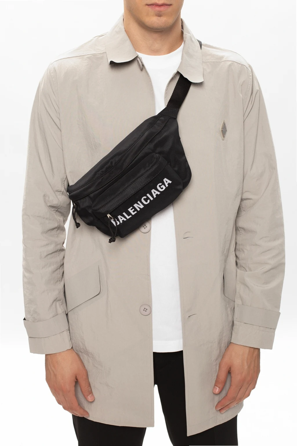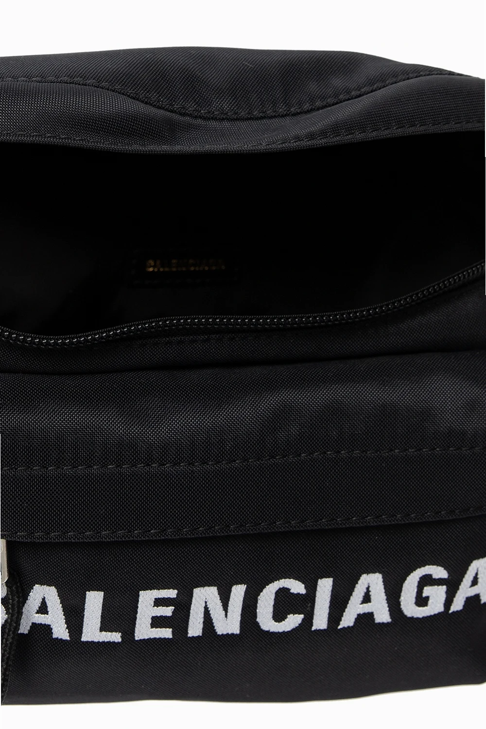 Czarna torba na pas, model 'Wheel' Balenciaga. Zamykana na zamek. Wyszyte logo w kolorze białym. Z przodu kieszeń zamykana na zamek. Regulowany pasek. Wewnątrz komora.