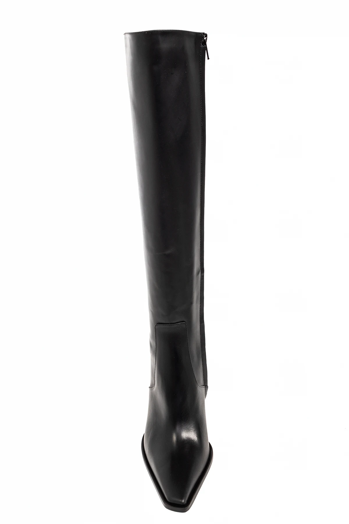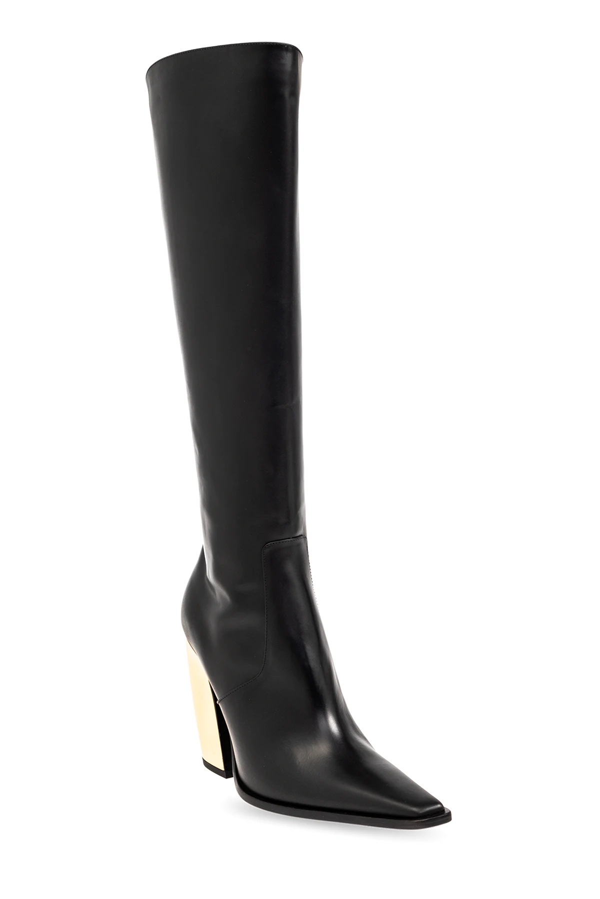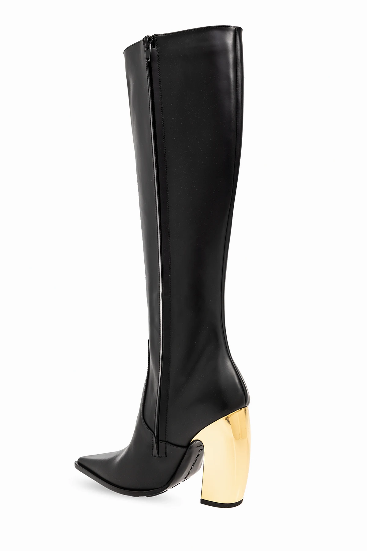 Czarne kozaki Bottega Veneta. Wykonane ze skóry. Zapinane na zamek. Dekoracyjny obcas w kolorze złotym. Nosek w szpic. Czarna, skórzana podeszwa ze wstawkami antypoślizgowymi.