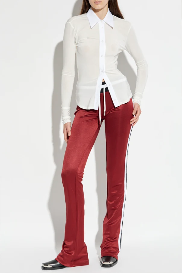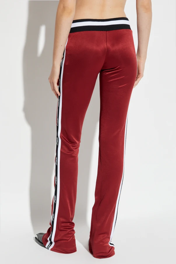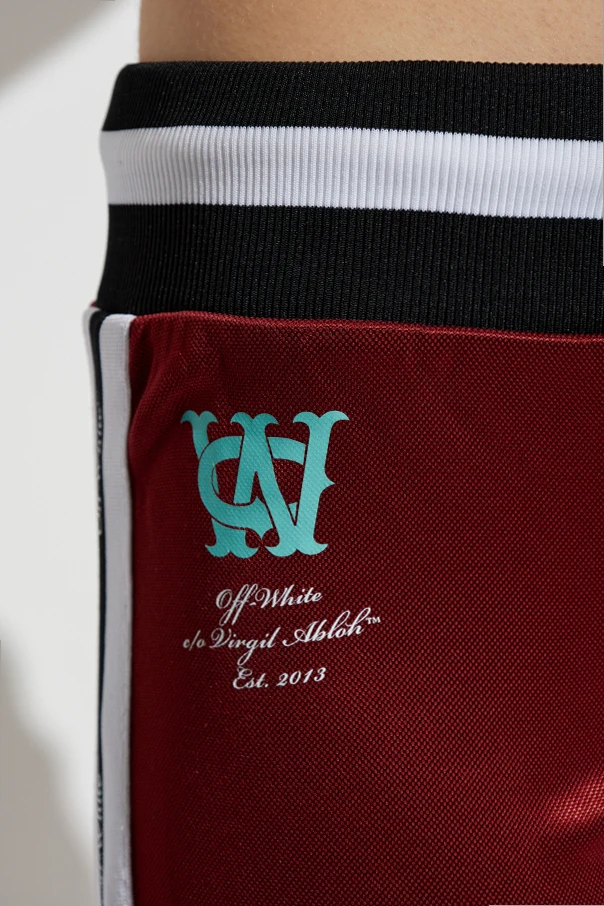 Spodnie dresowe z lampasami marki Off-White to wykwintna propozycja dla kobiet ceniących wyrafinowane, sportowe stylizacje. Dopasowany, lekko rozszerzany ku dołowi krój subtelnie podkreśla sylwetkę, nadając całości nowoczesny sznyt. Głęboki odcień bordo wraz z efektownym połyskiem materiału o wysokiej jakości, gwarantuje znakomite wrażenie zarówno na co dzień, jak i podczas wyjątkowych okazji.
