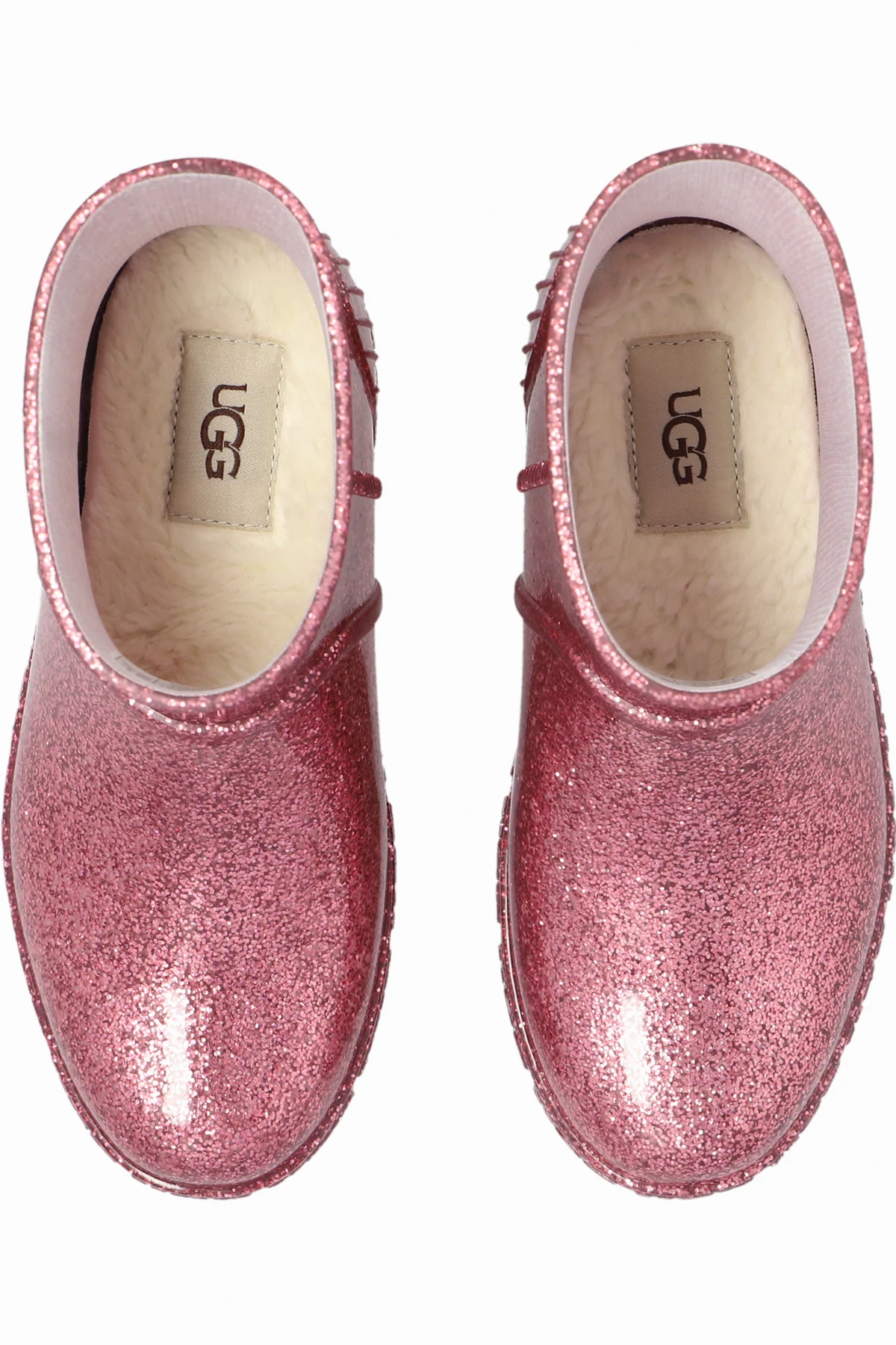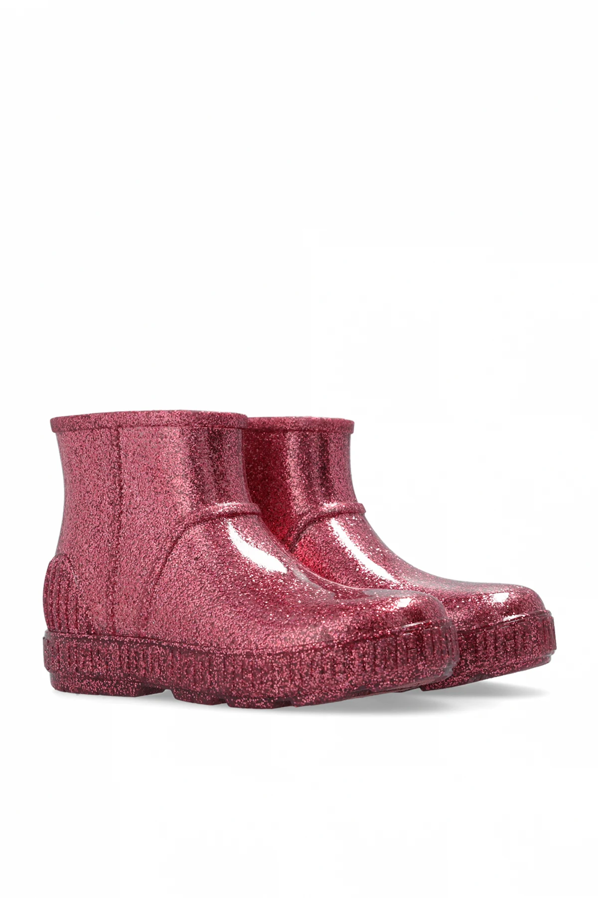 Różowe, brokatowe kalosze, model ‘Drizlita Glitter’ UGG Kids. Z tyłu wypukłe logo. Wkładka wykonana z UGGplush™- 60% wełna z recyklingu, 40% TENCEL™ Lyocell. Różowa, brokatowa podeszwa wykonana z gumy.