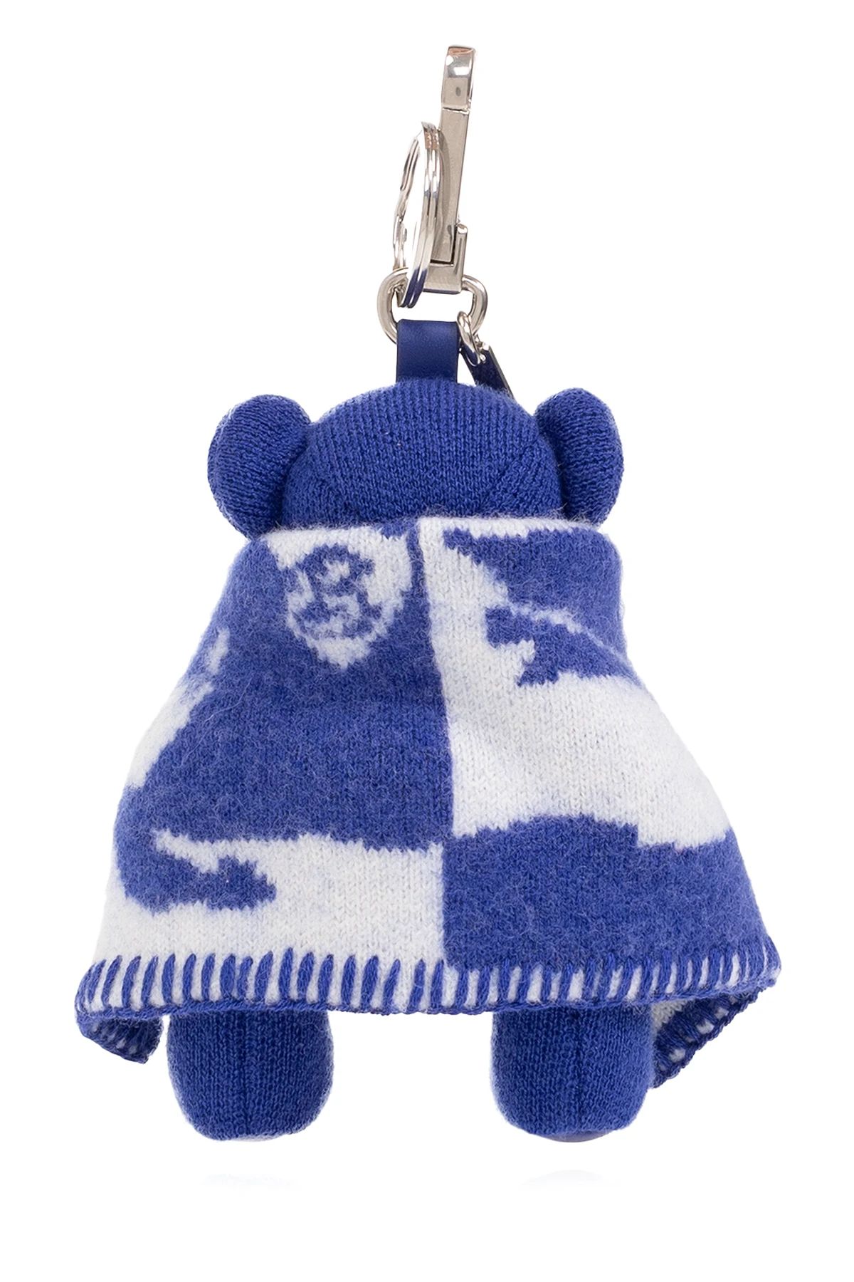 Niebiesko-biały brelok w kształcie charakterystycznego misia Burberry. Wykonany z wełny i kaszmiru.