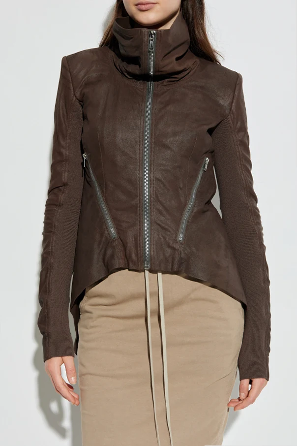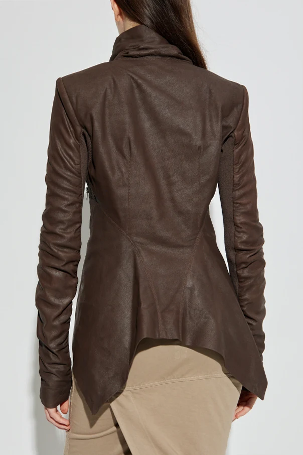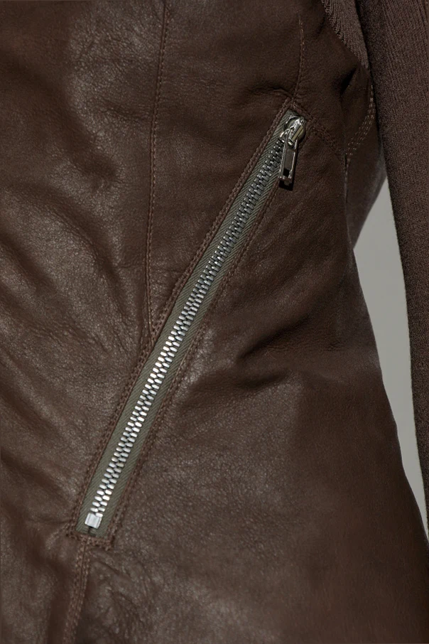 Skórzana kurtka ‘Naska’ autorstwa Ricka Owensa to esencja współczesnej elegancji, wzbogacona indywidualnym charakterem wybitnego projektanta. Model o starannie dopracowanym, dopasowanym fasonie zachwyca asymetryczną linią – wydłużony tył kontrastuje z krótszym przodem, nadając sylwetce dynamiki. Długie, przylegające rękawy z finezyjnym marszczeniem połączono z subtelną wstawką dzianinową, co wytwarza urzekający kontrast matowej skóry jagnięcej z miękką wełną.