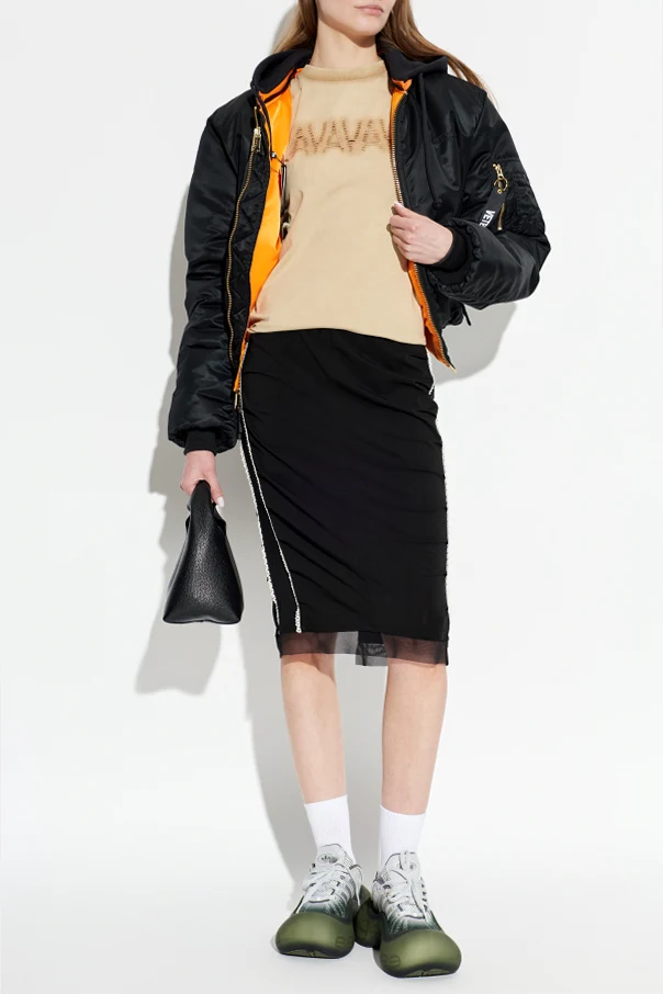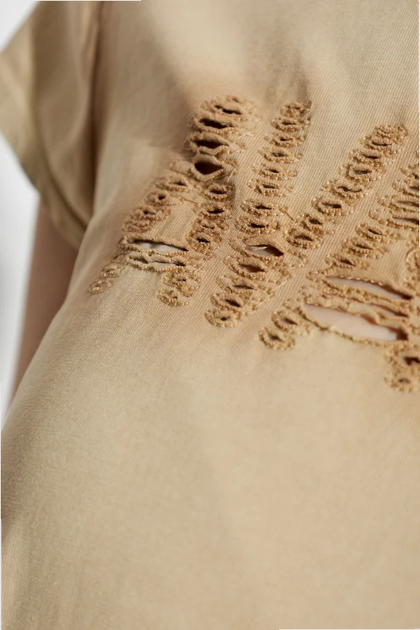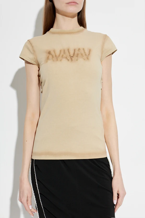 Klasyczny krój z lekko dopasowaną linią oraz okrągłym dekoltem harmonijnie podkreśla sylwetkę, a głęboka, czarna barwa nadaje mu ponadczasowy charakter. Wyjątkowym elementem jest rozpoznawalne, przetkane motywem wyciętego logo „AVAVAV” z przetarciami w tkaninie, wykonane w technice inspirowanej stylem vintage. Precyzyjnie opracowane detale oraz oryginalność wzoru sprawiają, że ten T-shirt wyróżnia się wśród klasycznych propozycji.