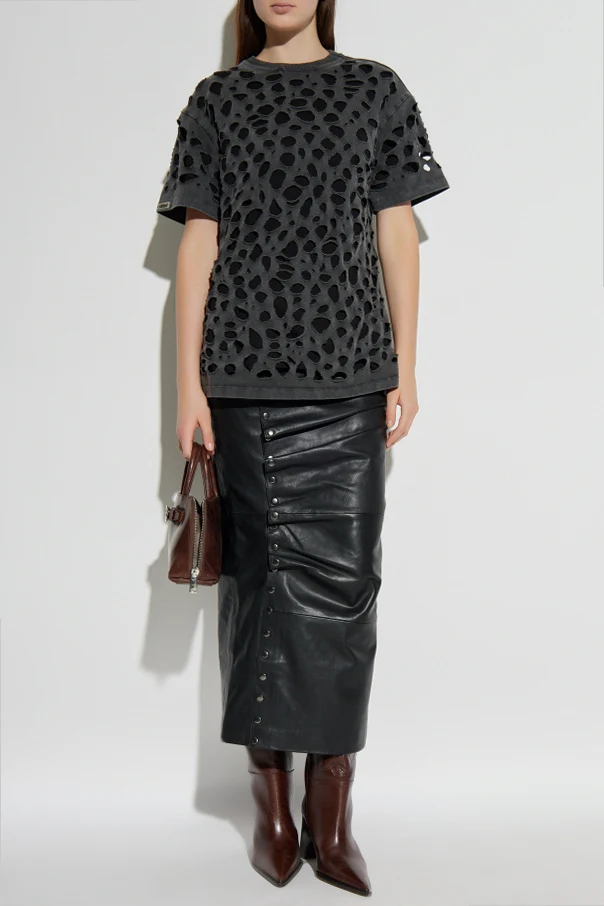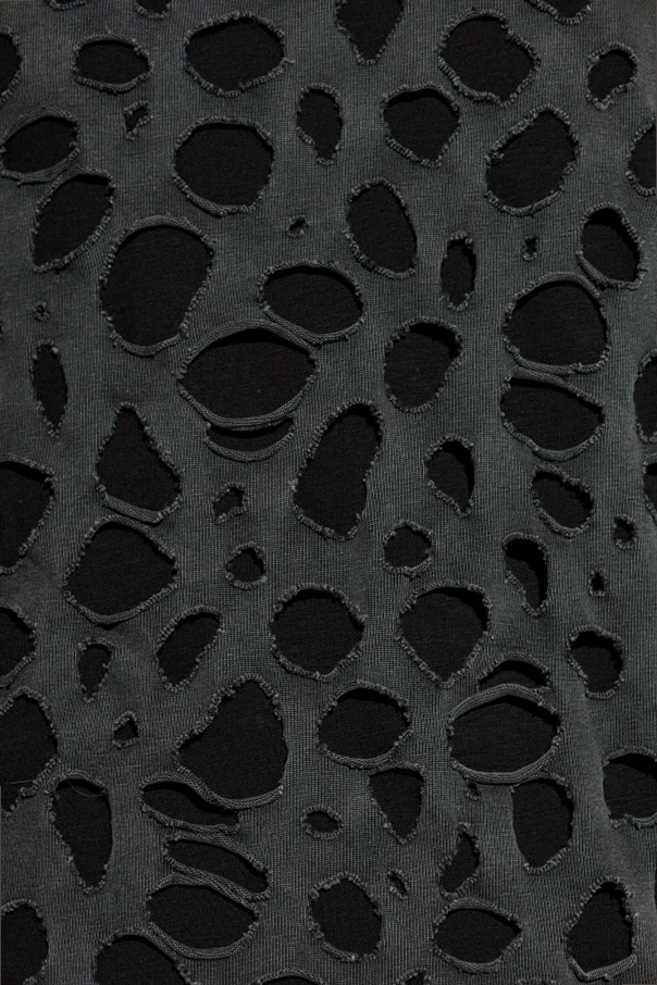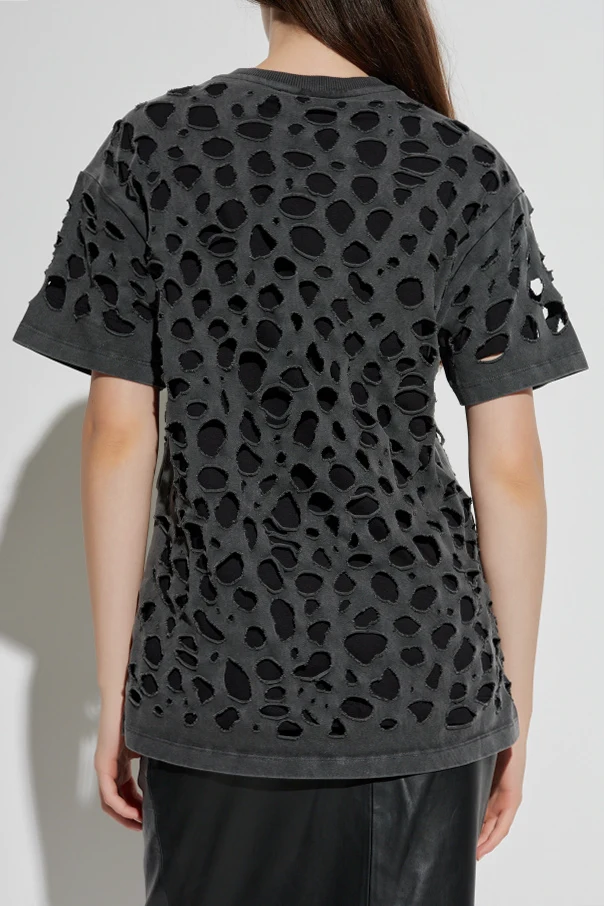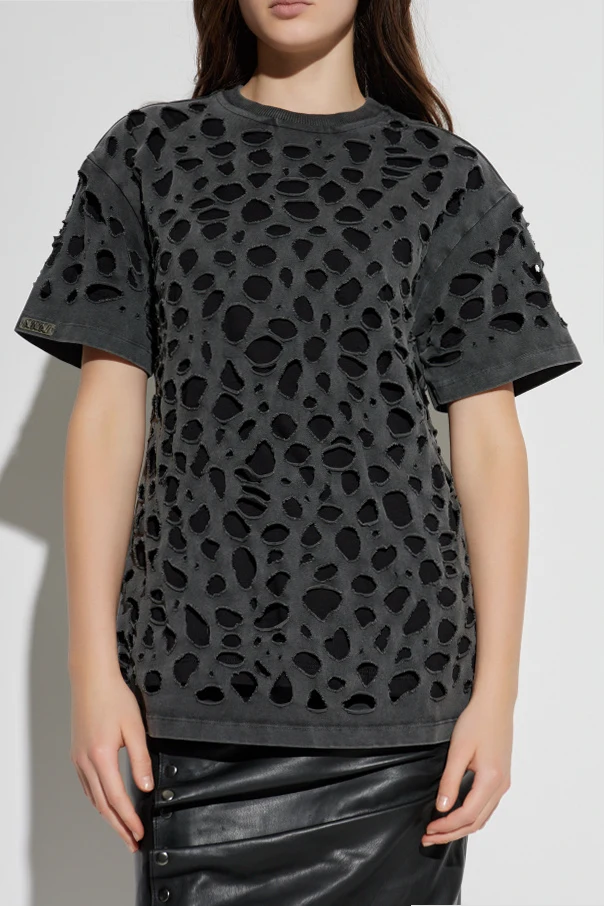 T-shirt z wycięciami marki AVAVAV to wyjątkowa propozycja dla koneserek odważnej elegancji we współczesnym wydaniu. Klasyczna, lekko oversize’owa forma została przełamana licznymi, nieregularnymi wycięciami – zarówno z przodu, z tyłu, jak i na rękawach – które tworzą awangardowy, niezwykle ekspresyjny wzór.