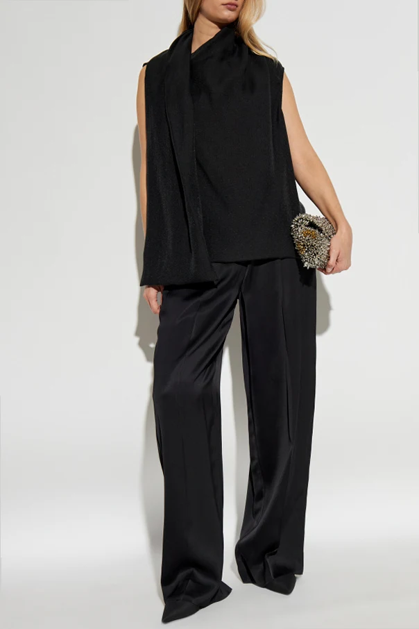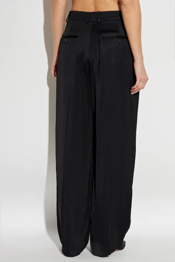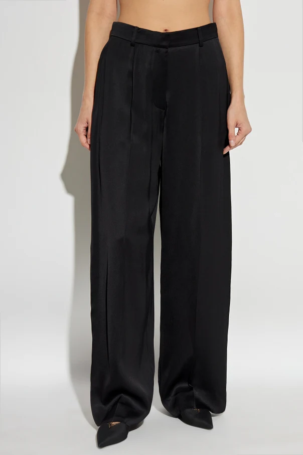 Spodnie z szerokimi nogawkami w kant marki TOTEME to esencja współczesnego minimalizmu, wyrażona w ponadczasowej elegancji czerni. Model o wyraźnie szerokich nogawkach typu palazzo przyciąga wzrok perfekcyjnie zarysowanym kantem, który harmonijnie przebiega przez całą długość nogi – od przodu aż po tył, nadając sylwetce wyjątkowy sznyt.