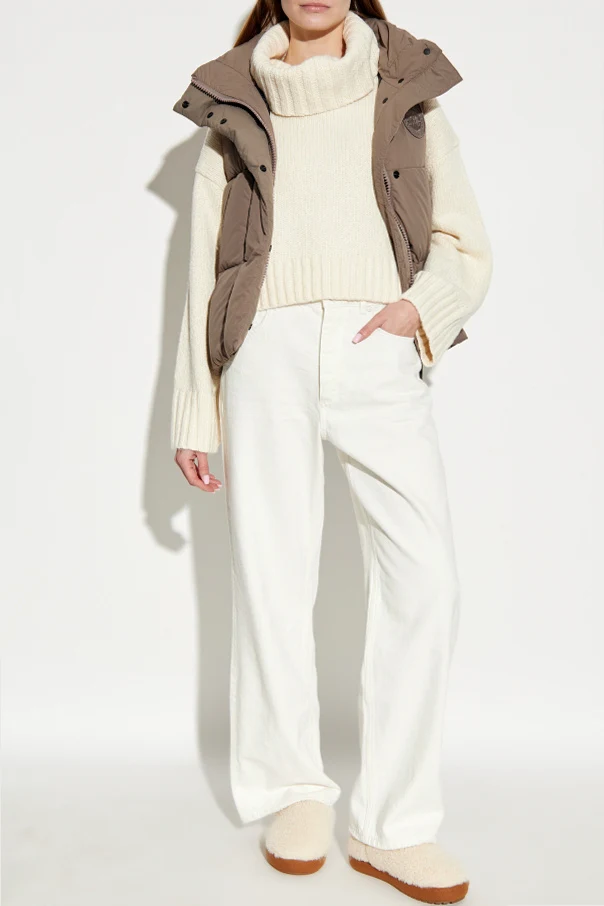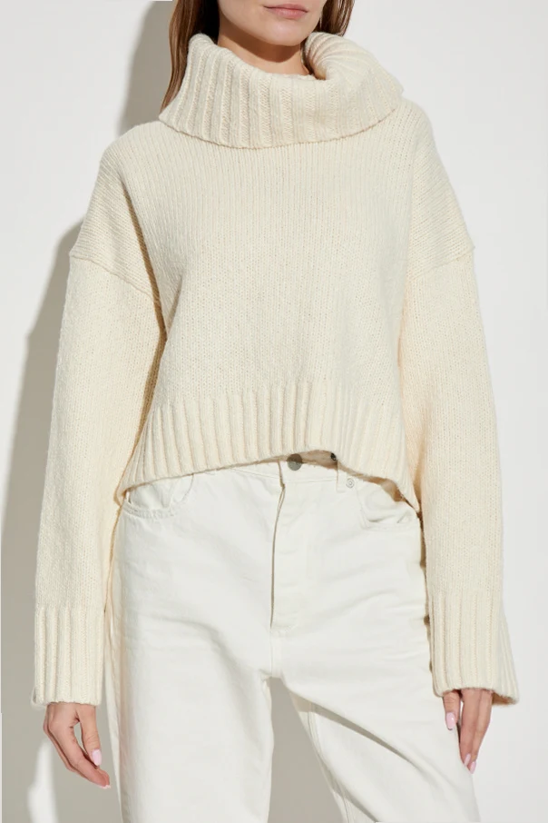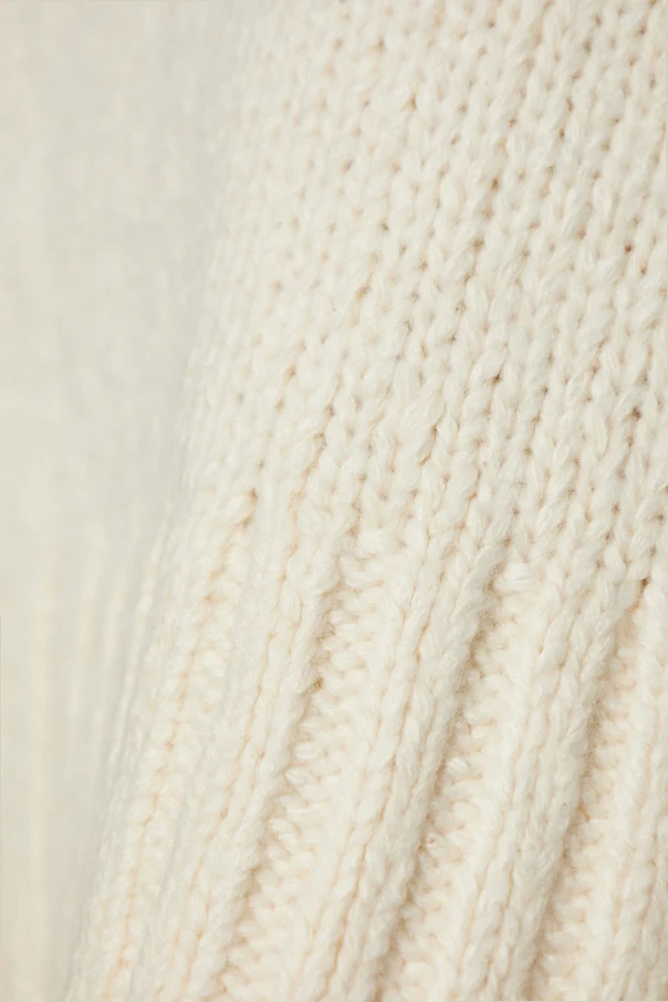 Golf „Belana” od marki Cult Gaia zachwyca swą precyzyjnie przemyślaną formą oraz kremowym wykończeniem. Luźny, lekko oversize’owy krój z opuszczoną linią ramion oraz szerokimi rękawami podkreśla subtelną lekkość i nadaje całości niebywałego komfortu. Strukturę swetra tworzy klasyczny wzór dzianiny, harmonijnie przechodzący w szerokie, wyraziste prążkowane ściągacze na rękawach i dole.