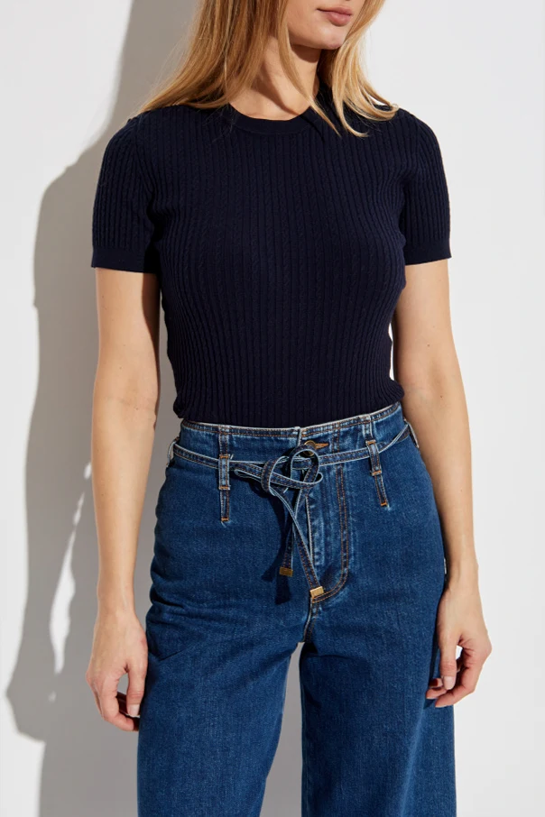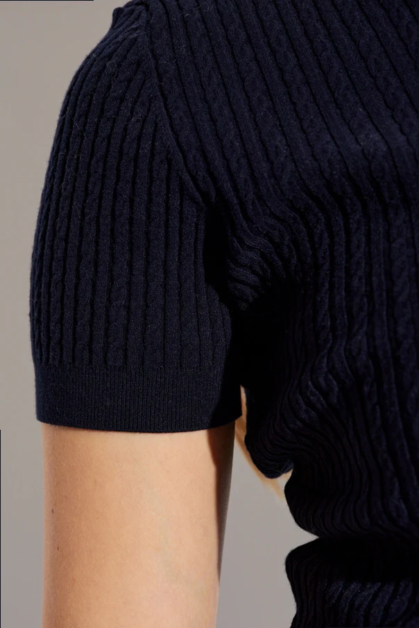 Top z okrągłym dekoltem marki FRAME to propozycja dla kobiet pragnących połączenia elegancji z wyrafinowaną prostotą. Granatowy odcień nadaje całości głębi i szlachetności, harmonizując z ponadczasowym fasonem. Top został starannie dopasowany do sylwetki – z lekko zwężaną talią oraz krótkim, przylegającym rękawem, efektownie podkreślającym ramiona.
